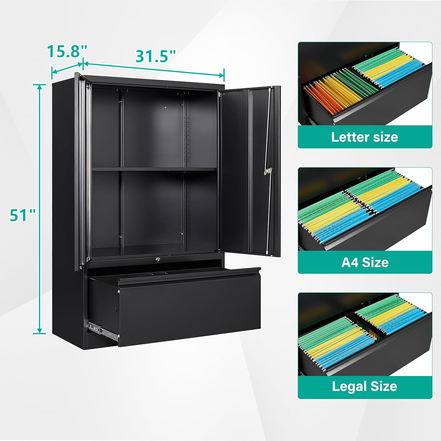 - ăEasy to Assembleăfile cabinet 51.18''Hx31.5''Wx15.75''D (HxWxD), 2 wing doors 180° opening angle, product includes 1 cabinet, instruction manual. At the same time, we provide an installation video, allowing you to easily install the locker within 15 minutes, besides, if you have any product problem, you can always contact us & solve it within 24 hours