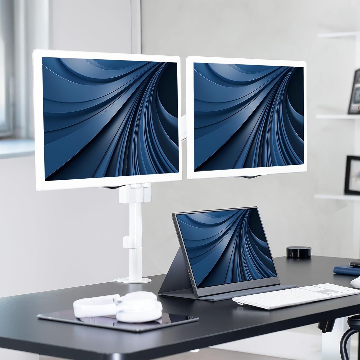 - Articulation and Height Adjustment: Flexible arms offer smooth tilt, swivel, and full rotation for comfortable viewing angles. Dual pneumatic springs provide smooth height transitions by perfectly counterbalancing the weight of your monitors