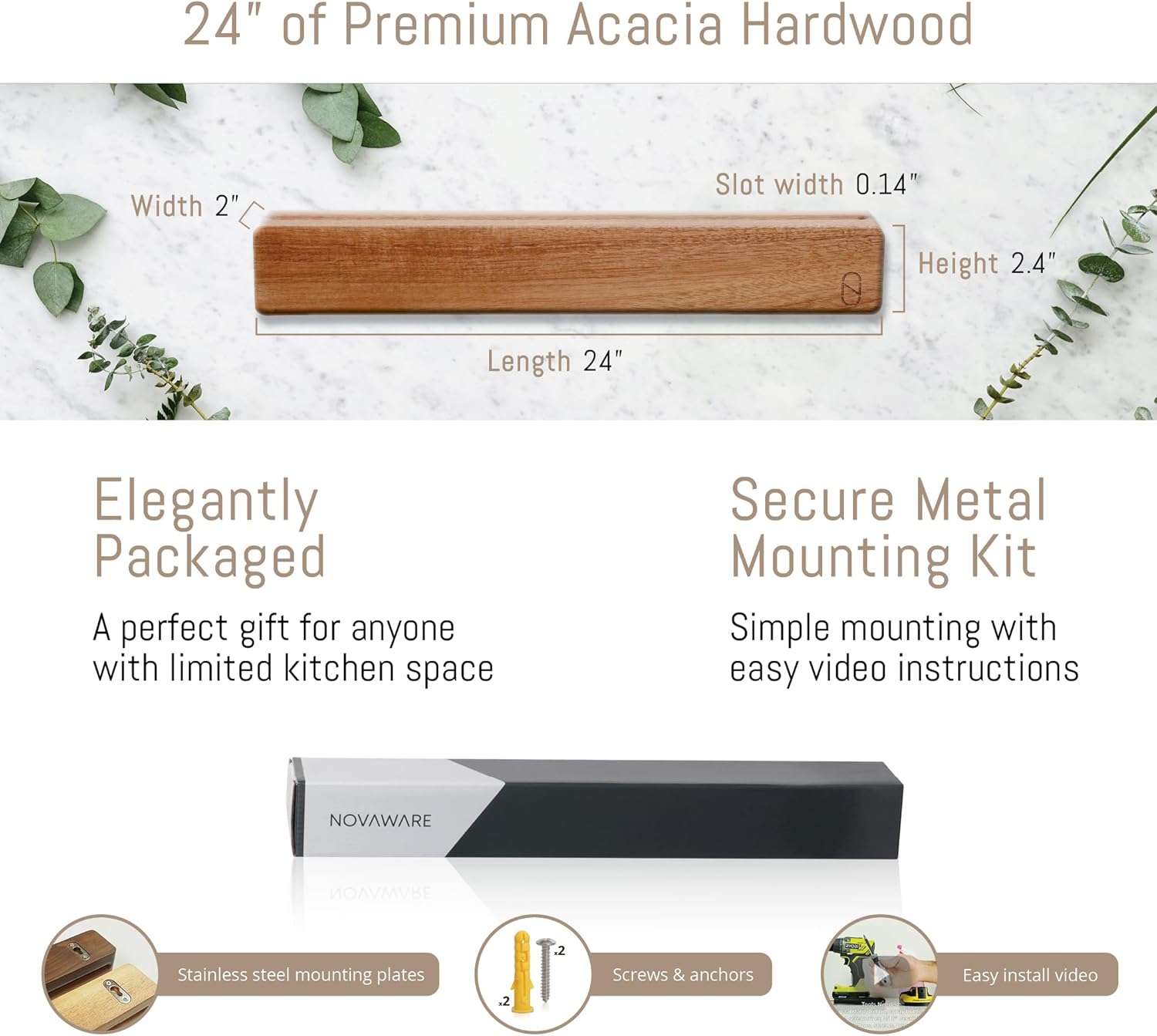 - UNIQUE & ELEGANT DESIGN – Made with 24” of premium acacia hardwood, our magnetic knife bar comes in a unique and elegant finish that blends with any kitchen style. Its simple and modern design rests the magnets and mounting plates nicely out of sight to appear to ‘float’ on your kitchen wall. The premium hardwood face and inner slip is designed magnet-free to reduce friction against the wood, preventing your knives from being damaged or dulling sooner. This keeps them sharper for longer.