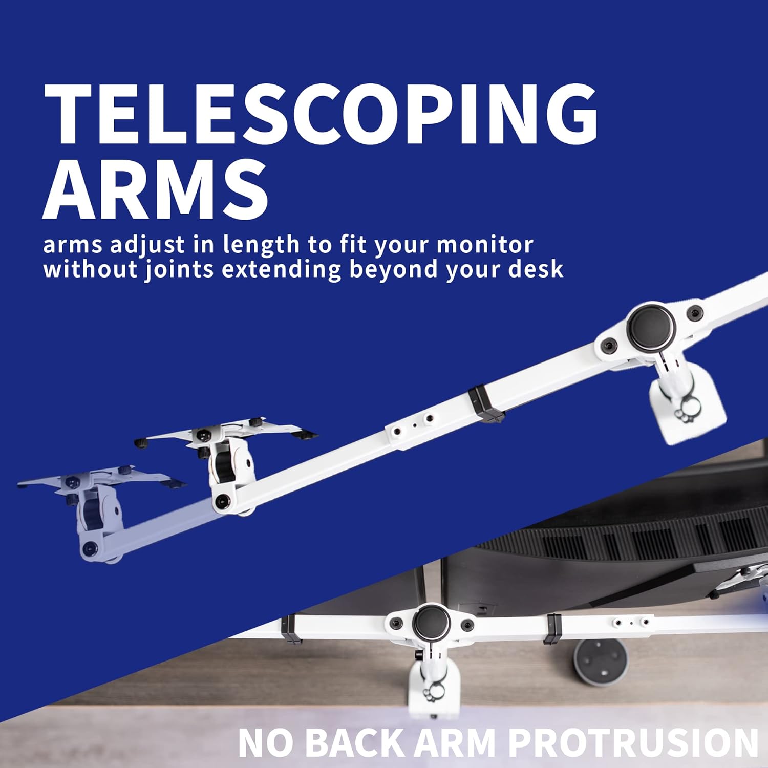 - Premium Telescoping Arms: Heavy-duty telescoping arms adjust in length to fit the size of your monitors. The arms slide into each other for added strength and stability