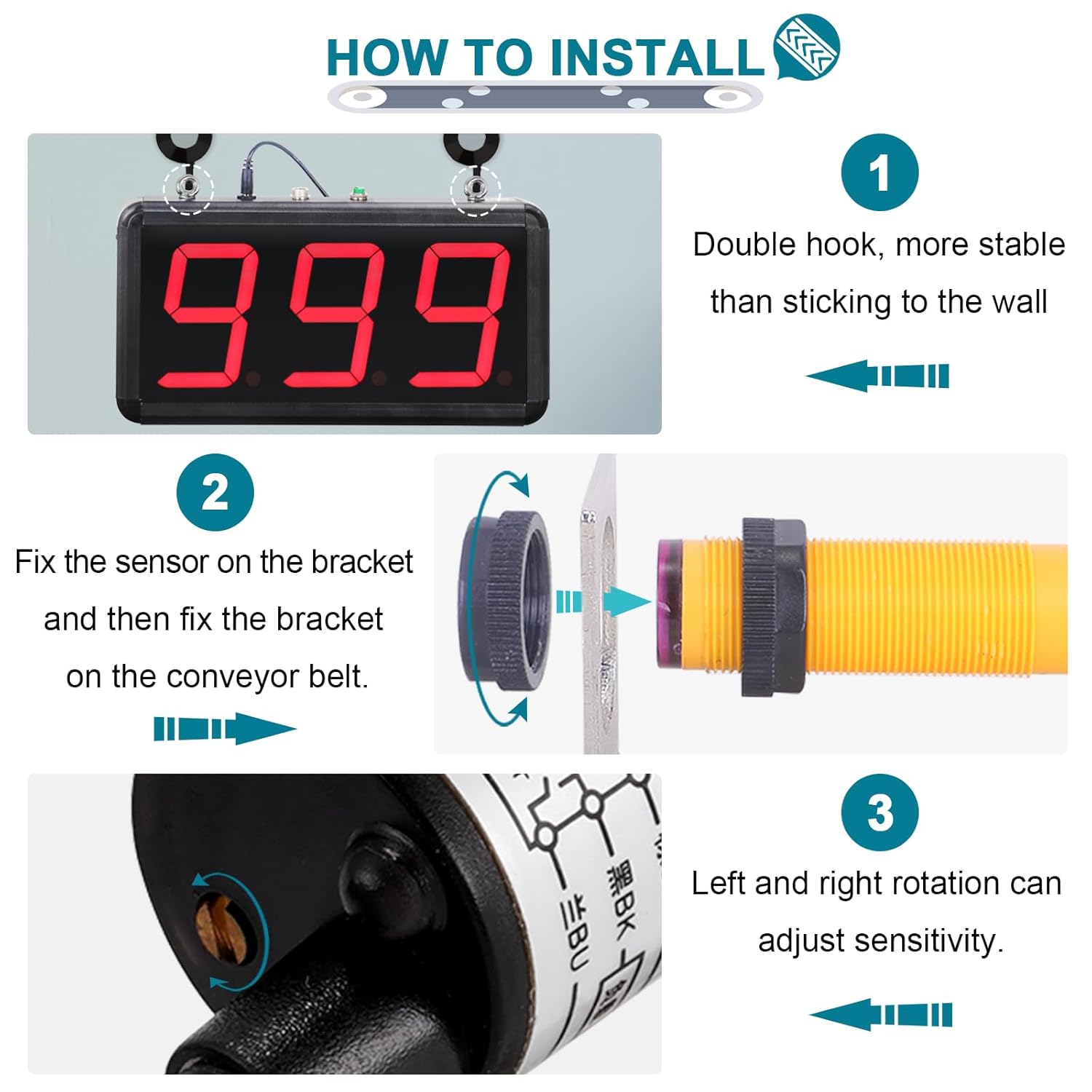 - SIMPLE OPERATION: the display screen is equipped with 2 hooks, which are convenient to install at any position. The sensor with bracket can be fixed on either side of the conveyor belt