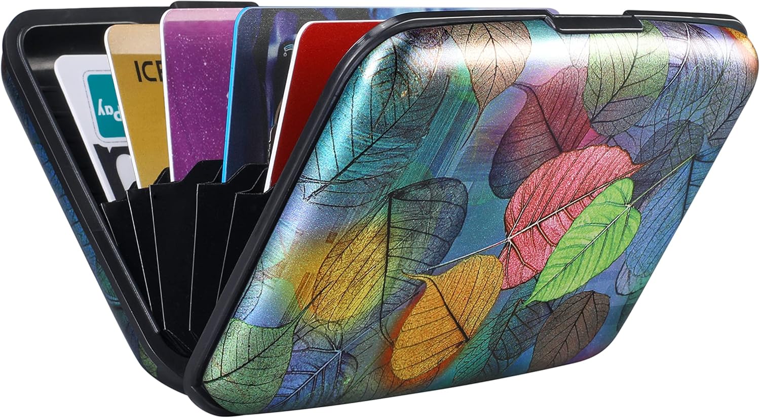 ELFISH Mini RFID Aluminum Wallet Credit Cards Holder Business Card Case Metal ID Case for Men Women(Colorful Leaves