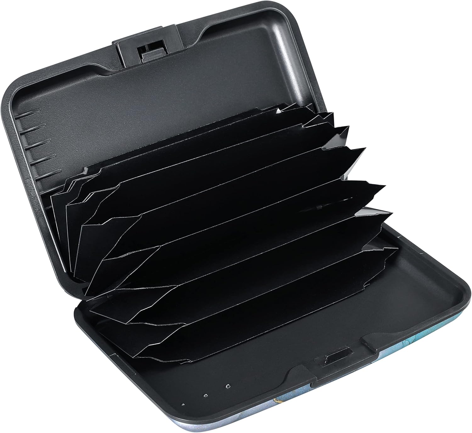 - Latches safely and securely when not in use. Rounded corner wouldn't damage on your clothes. With 7 accordion Slots, Capacity for up to more than 9 credit cards or more than 21 business cards.