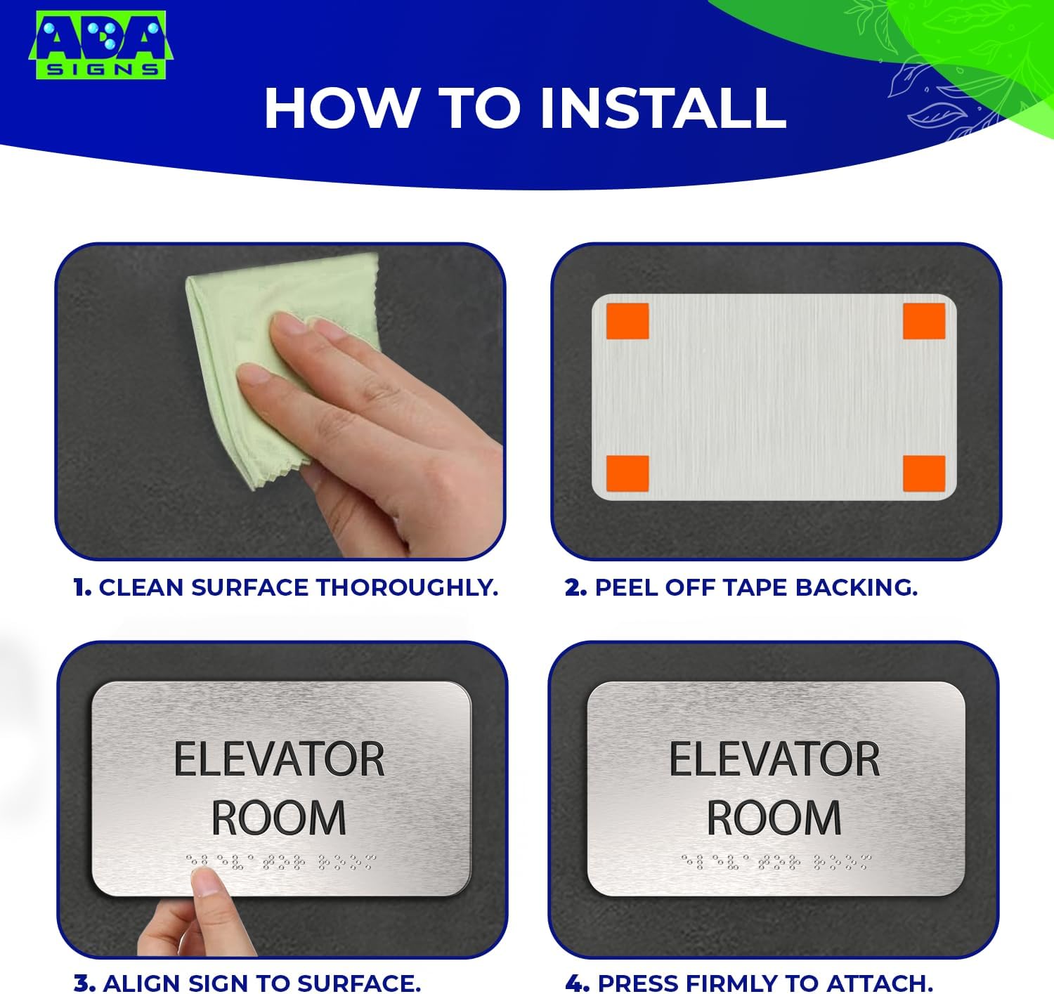 - EASY INSTALLATION WITH HEAVY DUTY MOUNTING - Our elevator aluminum brushed silver business signs include heavy duty double sided mounting tape and ADA compliant installation instructions for a do-it-yourself install