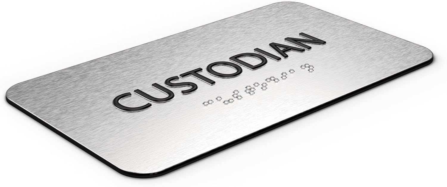 ADASigns Custodian Closet Sign 7" W x 4" H Durable Brushed Aluminum with Grade 2 Braille - Easy Installation with Adhesive Double Sided Tape - ADA Compliant Custodian Sign for Office & Businesses