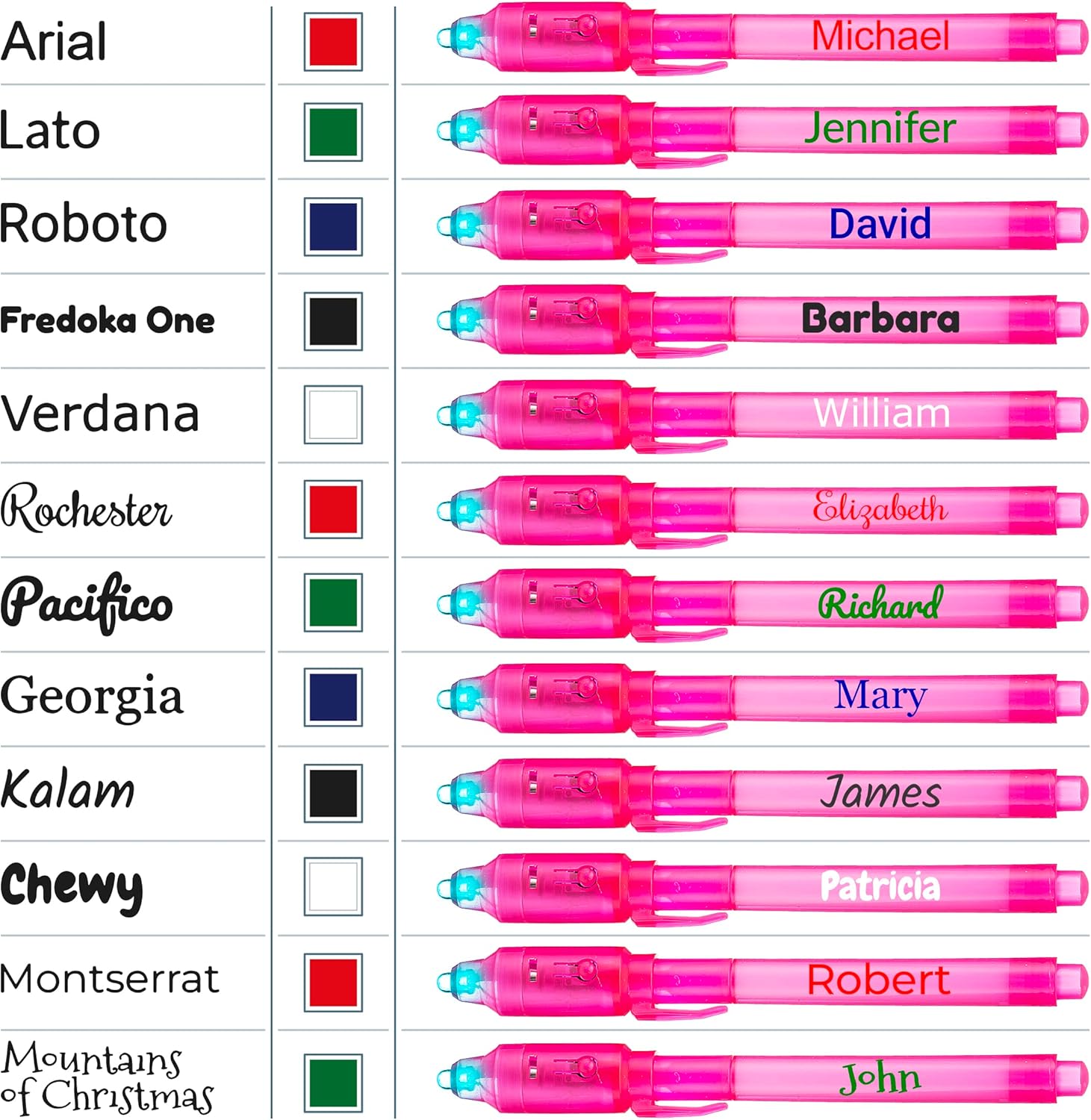 - GREAT GIFT FOR FUN PARTY FAVORS: These Personalized Invisible Spy Pens with light come in a pack of 12 Assorted barrel colors to make the activity more exciting and fun.The color of the light is blue and it will display the words written in clear ink for all pens. Batteries are included and installed. Parents can buy these Spy Pens for their kidβs party at home. Schools, Teachers can buy it for students for a school Activity. Add it for any surprise gift bag or as Stock Stuffers.