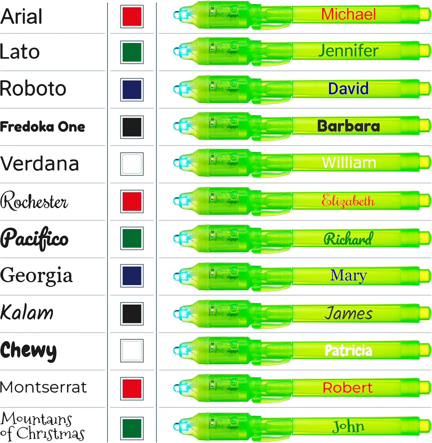 - GREAT GIFT FOR FUN PARTY FAVORS: These Personalized Invisible Spy Pens come in a pack of 24 Green Pens to make the activity more exciting and fun.The color of the light is blue and it will display the words written in clear ink for all pens. Batteries are included and installed. Parents can buy these Spy Pens for their kidβs party at home. Schools, Teachers can buy it for students for a school Activity. Add it for any surprise gift bag or as Stock Stuffers.