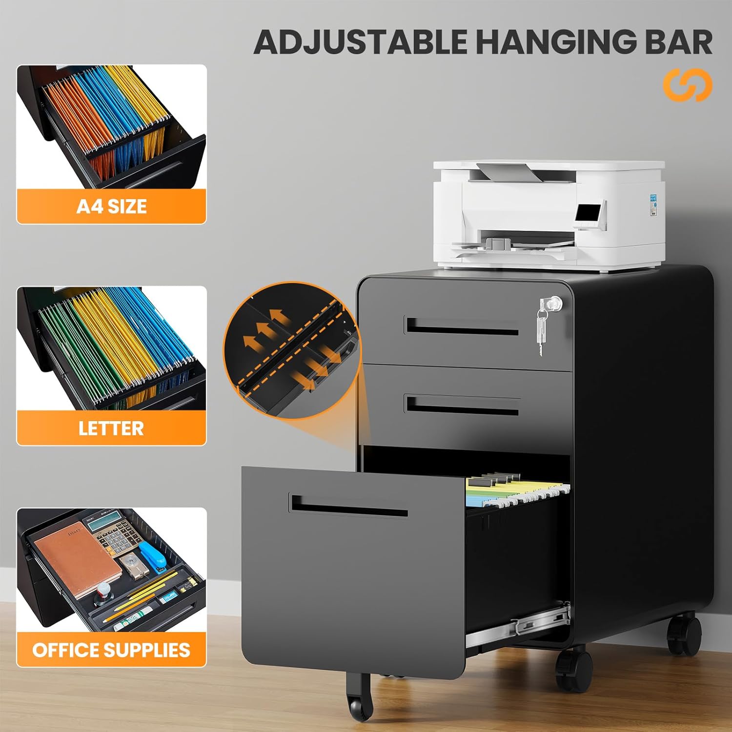 - â–¶3 DRAWER FILE CABINET: The upper 2 drawers can accommodate stationery and small items. The bottom drawer file drawer is equipped with 2 removable hanging bars, the filing cabinet can accommodate letter size, legal size, and A4 hanging file folders through free combination, it can also store various files and books. With Full Extension Drawer slides, the drawer opens completely, allowing you to easily access the contents in the back of the drawers.