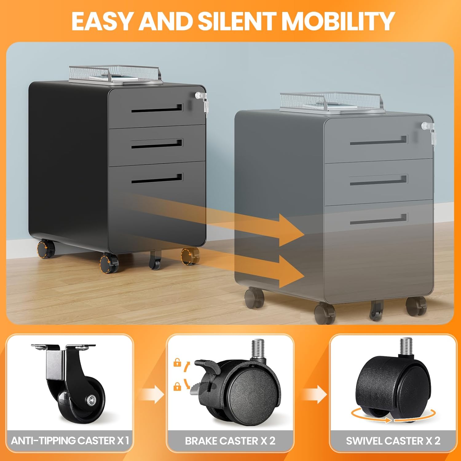 - â–¶FREE MOVABLE: This rolling file cabinet comes with 4 casters to move smoothly from room to room and adjust in the position freely, which can securely lock in place to prevent any unwanted movement and add stability.