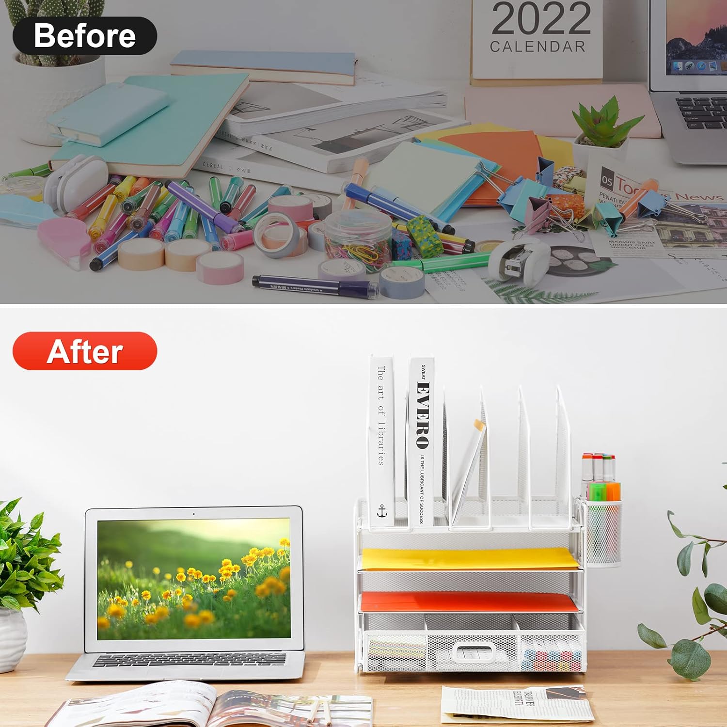 - 【Multifunctional Desk organizer】Marbrasse upgrade desktop file organizer has vertical and horizontal storage space – 4 sliding trays +5 vertical sorters +3 compartments drawer+ additional 2 pen holders . Upright section has five 3" Compartments for magazines, bill, file, book. Three types of use to meet your various office needs!!
