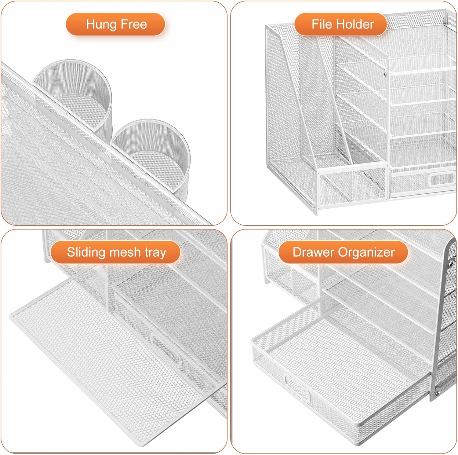 Marbrasse Desk Organiser with File Holder, 5-Tier Paper Letter Tray Organiser with Drawer and 2 Pen Holder, Mesh Desktop Organizer and Storage with Magazine Holder for Office Supplies(White)