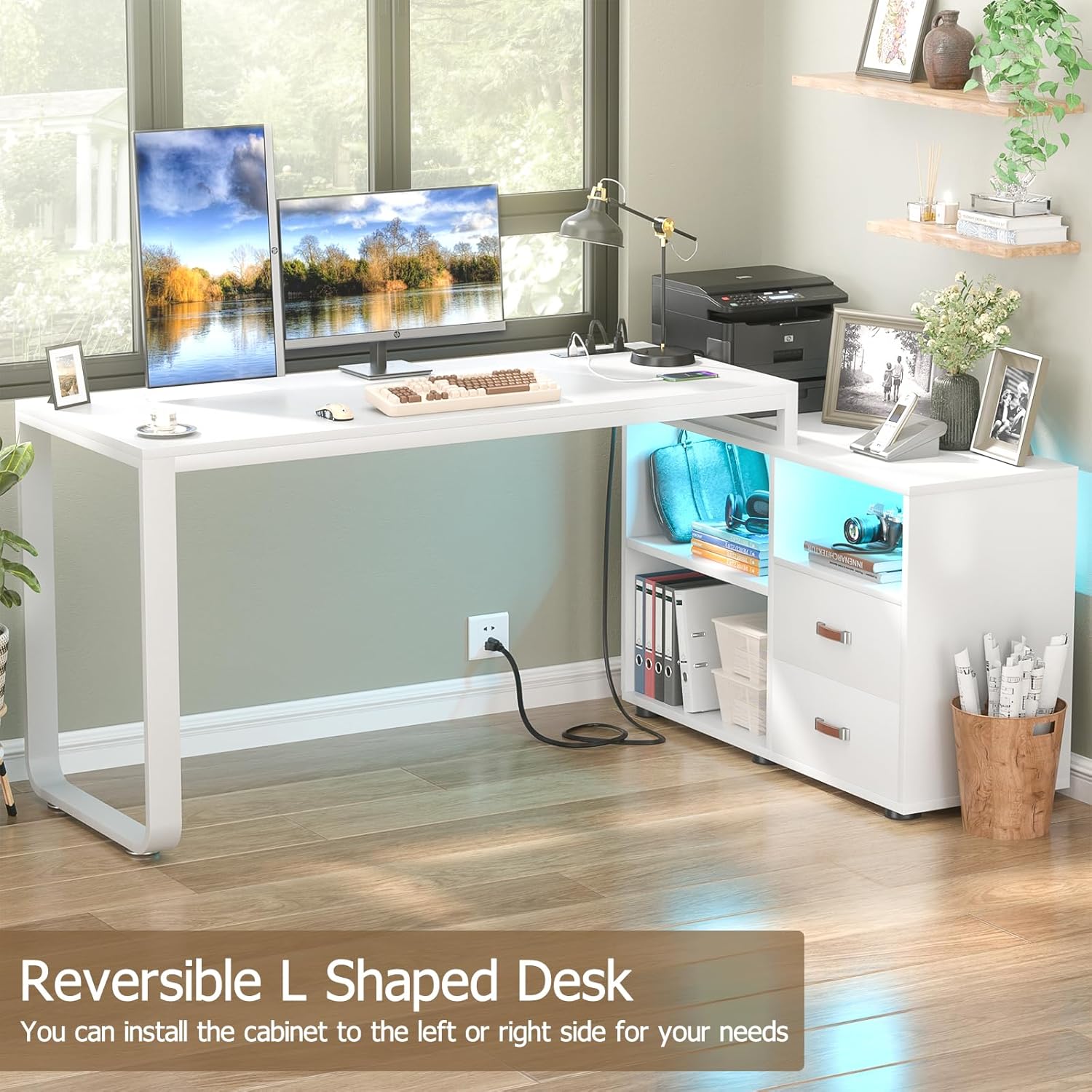 Homieasy L Shaped Desk with File Cabinet & Power Outlet, Reversible 55 Inch Large Corner Computer Desks with LED Strip, L-Shaped Desk with Drawers and Storage Shelves for Home Office, White