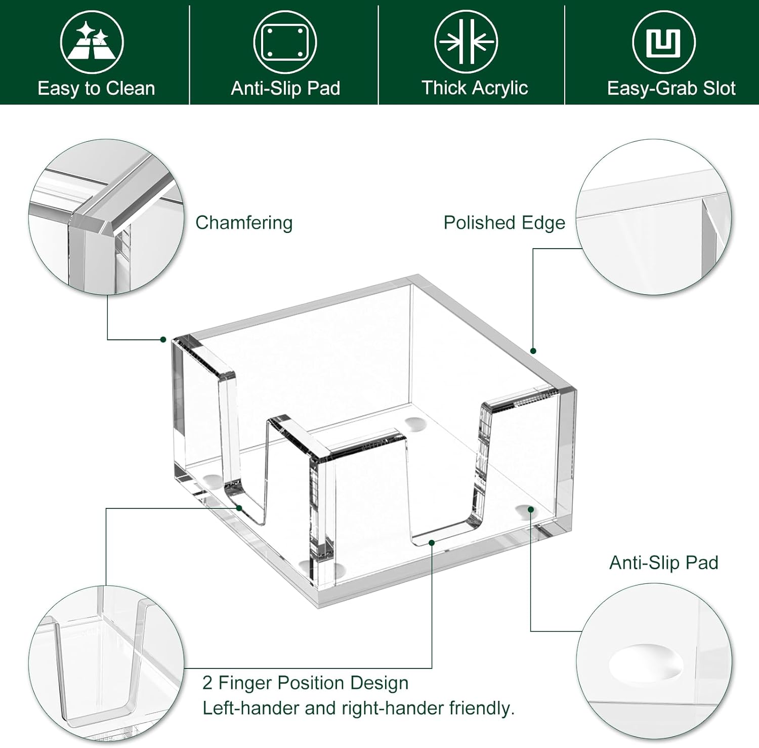 - Non-skid Silicone Pads - beneath each corner of the acrylic sticky note dispenser, make it stay in place with no slide or scratch on your desk. The solid acrylic memo pad holder is a great home office set up accessories decor, a good-to-have decent desk organizer.