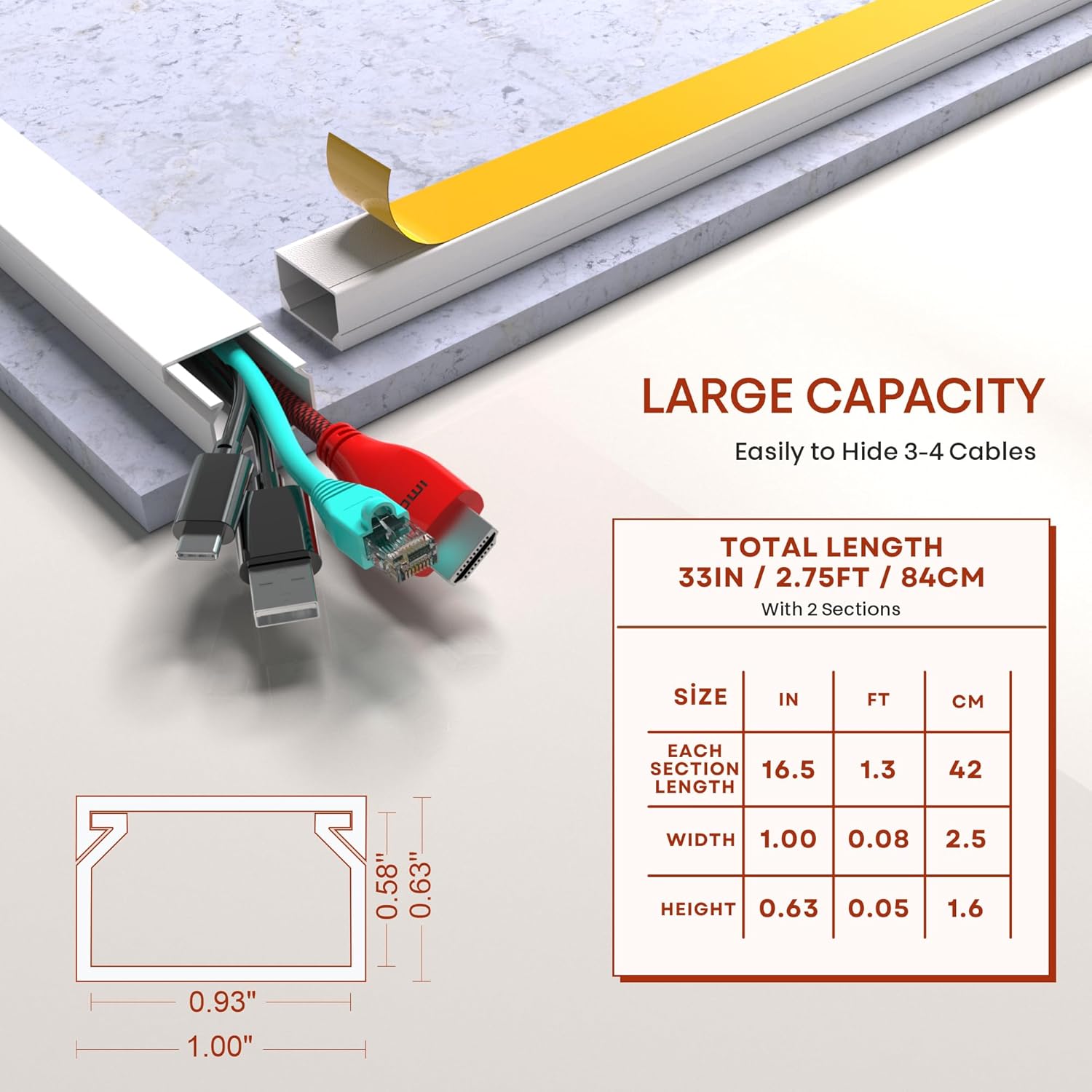 - Cable Capacity of Premium Quality Wire Covers for Cords Wall Mount TV : Length of each cable channel is 16.5". This cable covers fits up to up to 1" Wide / 0.63" high - for example : 2 HDMI cables + 2 regular USB / AUX cables). It is easy to hide 3 - 4 cables with wire hiding strip for wall. Hide wires along wall with our cable track uses high-quality PVC material. Perfect electric wire hiders for tv on wall. Please reach out to us with purchase.