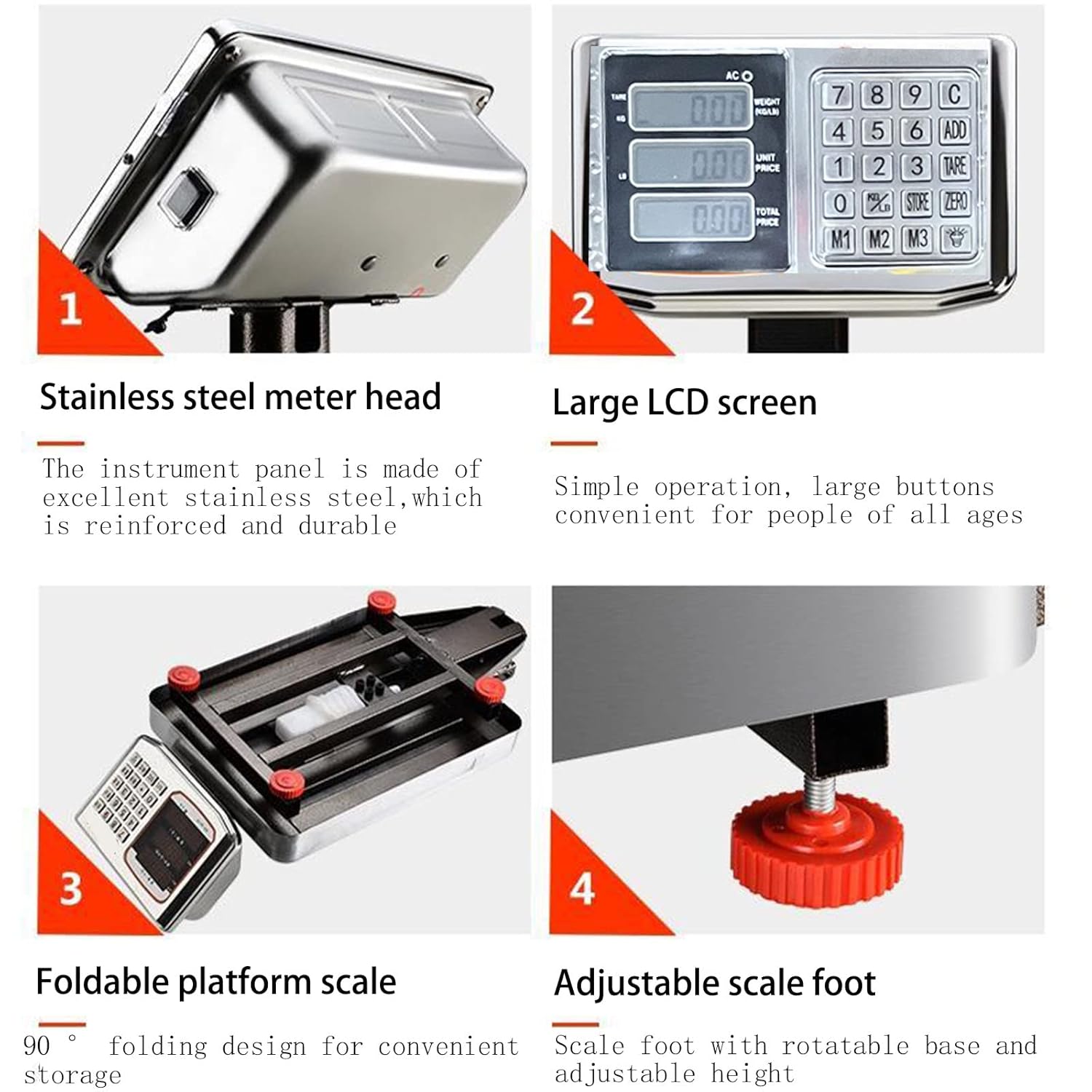 - ă90°Folding Designă: With 90 degree right angle folding design, you can easily take the digital scale to any place for use, such as vegetable/seafood market, factory warehouse, postal parcel, shipping weighing luggage, etc. And it is easy to store, the industrial scale size is (H32.3*L19.7*W15.8)in Folding size is (L19.7*W15.8*H7)in