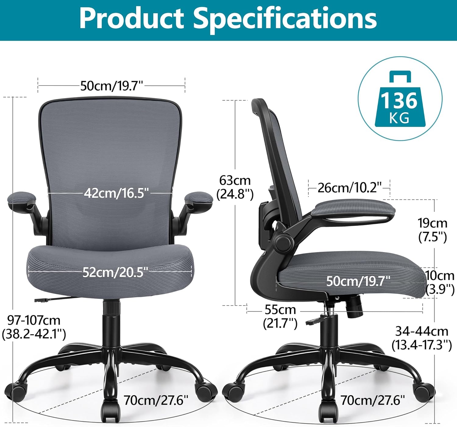 FelixKing Office Chair, Ergonomic Desk Chair Breathable Mesh Chairs with Adjustable High Back Lumbar Support Flip-up Armrests, Executive Swivel Comfy Task Computer Chairs for Home Office Dark Gray