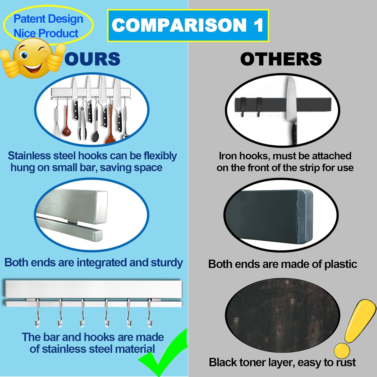 - 【Secure Storage for Even Large Knives】Our holder, constructed from high-grade 304 stainless steel, incorporates a Neodymium magnet and Ferrite magnet. This double magnetic duo effect your entire knife set, even the larger knives and utensils. It will never rust nor lose its magnetism, and never fall