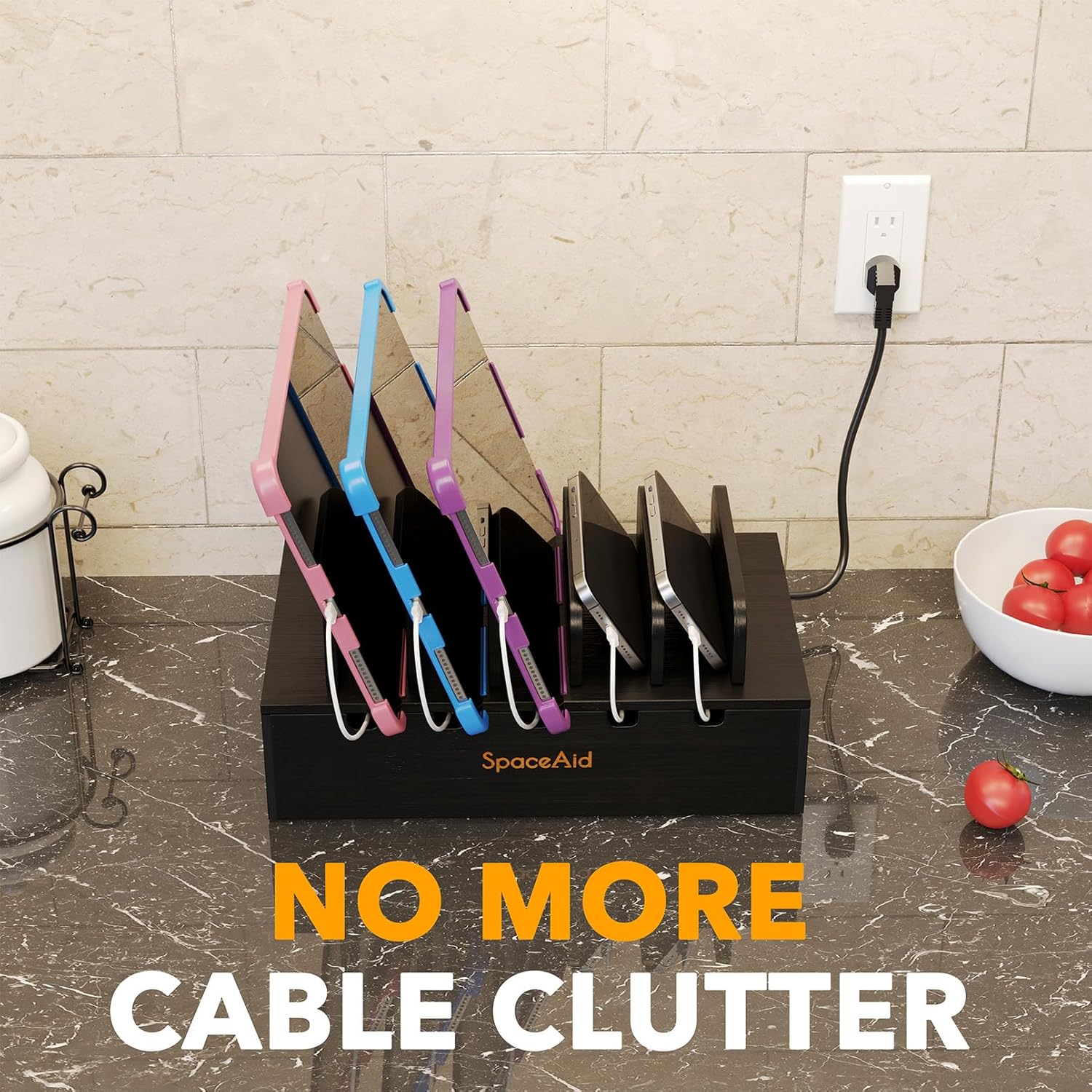 SpaceAid Bamboo Charging Station for Multiple Devices, Cell Phone Docking Stations for Multi Laptop, Tablets and iPads, Nightstand Bedside Desk Device Charger Organizer (Black)