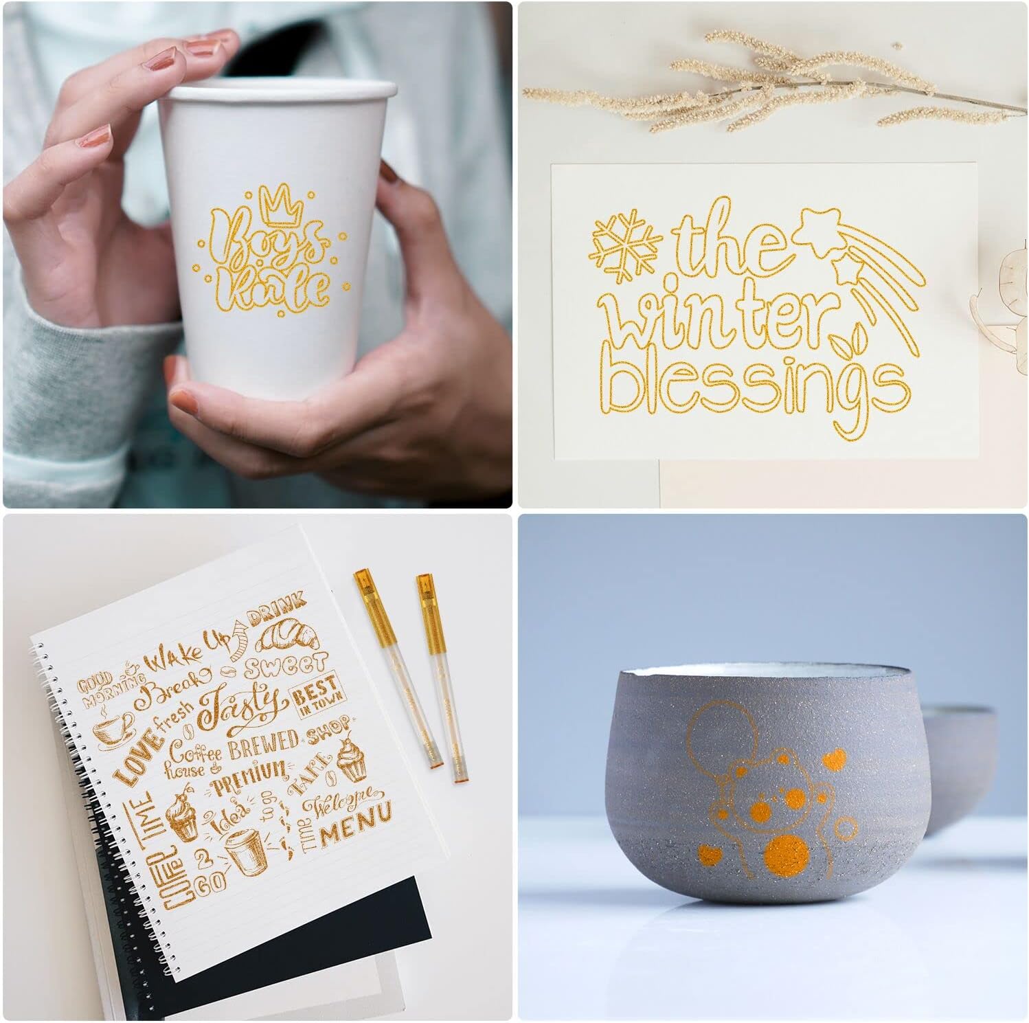 - The medium point metallic pens can be applied to most flat surface object, like: papers, rocks, woods, metal, plastic , glass , canvas, ceramic, fabric, DIY photo album, craft , and more. Outstanding performance for black paper, arts and crafts, DIY projects, scrapbooks , customized mugs, painting, card making, calligraphy and more.
