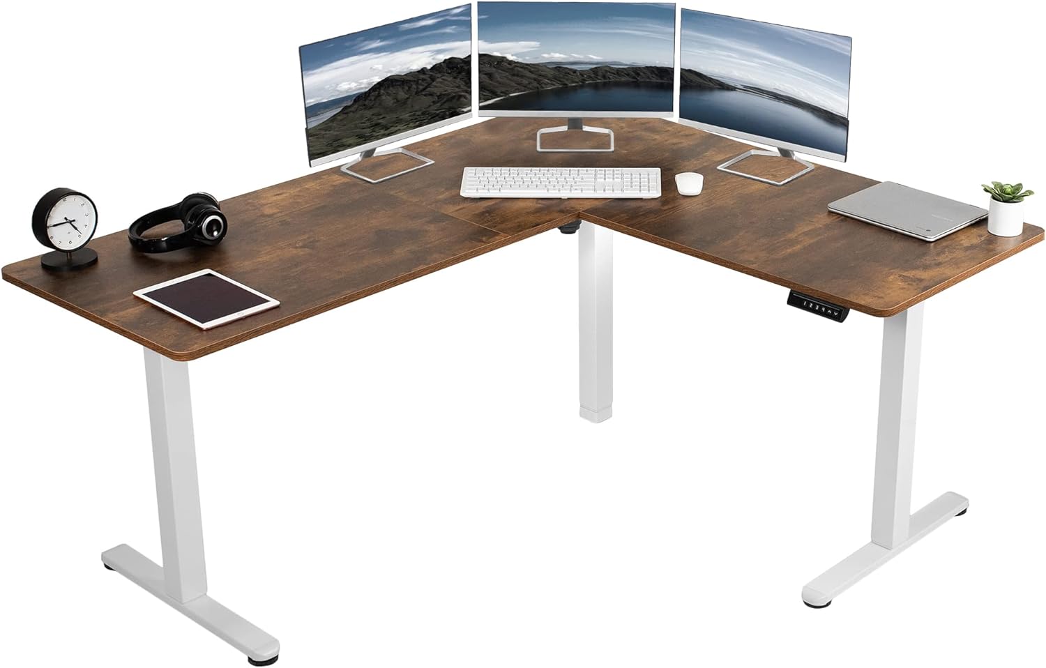 VIVO Electric Corner L-Shaped 63 x 55 in Rustic Standing Desk, Memory Height Adjustment, Vintage Brown Top White Frame, DESK-E3CTWN
