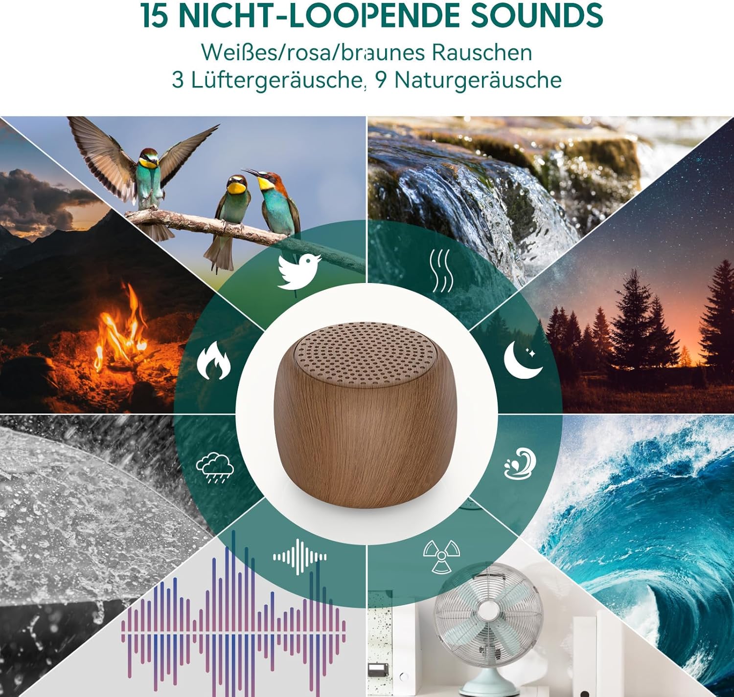 Babelio White Noise Sound Machine for Adults Kids Baby, Mini, 15 Non-looping Sounds, Timer, Memory Function, Easy to Pocket and Travel Wood Grain