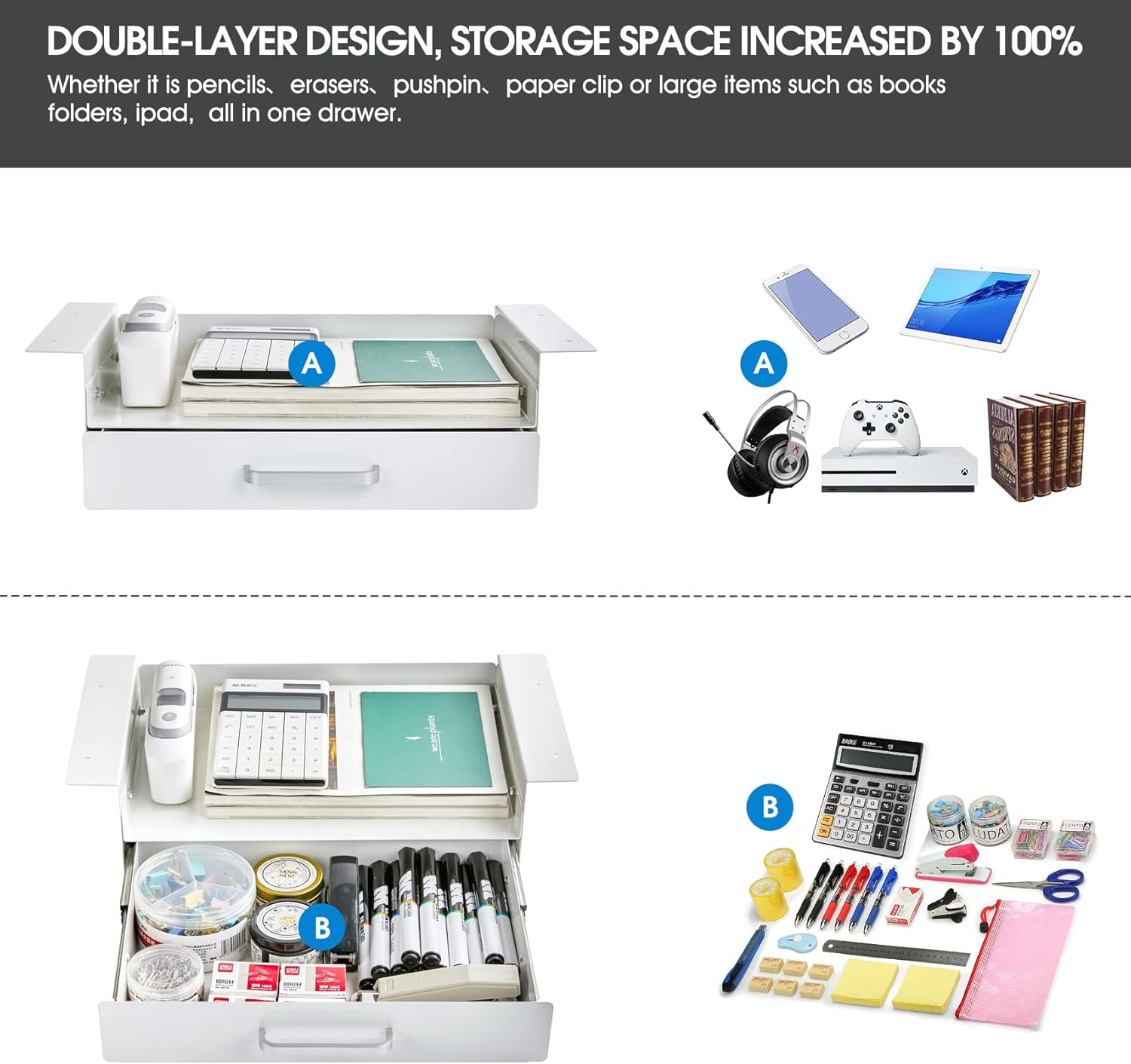 - 【Extra storage space】-- The upper layer of the drawer creates additional storage space, and something that cannot be placed in the drawer can be placed on the upper layer, such as folders, books, ipads, calculators and other bulky items.