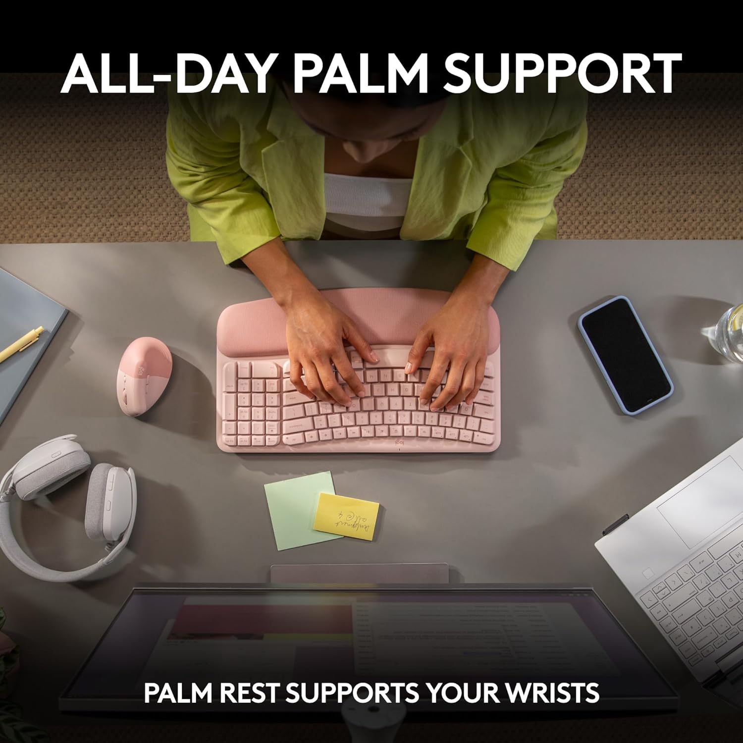 Logitech Wave Keys Wireless Ergonomic Keyboard with Cushioned Palm Rest, Comfortable Natural Typing, Easy-Switch, Bluetooth, Logi Bolt Receiver, for Multi-OS, Windows/Mac - Rose