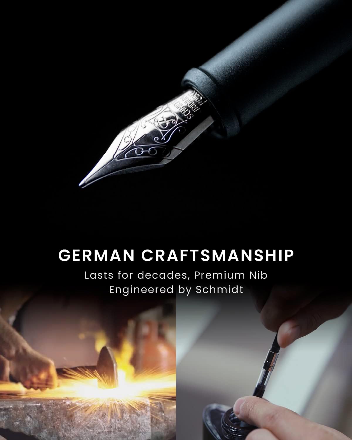 - β Addictivve & Silky Writing Experience: Your creativity needs to flow uninterrupted. This 2-In-1 Set comes with extra rollerball pen grip. Schmidt rollerball cartridge, and stainless steel fountain pen nib from Schmidt, the Germany company with over a century of experience in craftmanship excellence. Thanks to their exquisite inflow design, pure, unbroken lines of thought jump forth from the pen to paper without spills, spotting, or explosions.