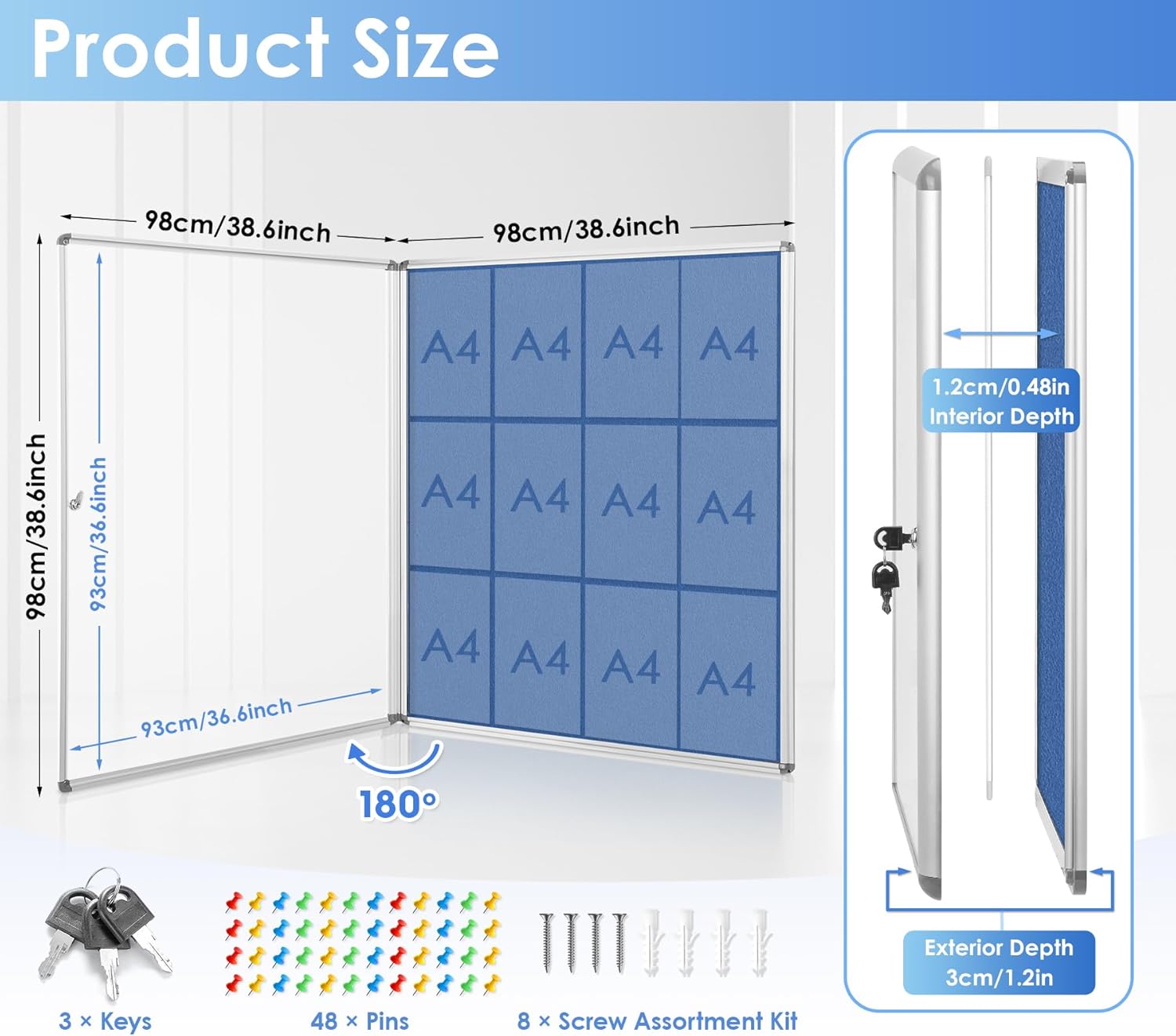 SWANCROWN Pins Bulletin Board Enclosed Lockable Noticeboard Glass Display Case for Home Office School,Blue Fabric,38"x38" (12xA4)