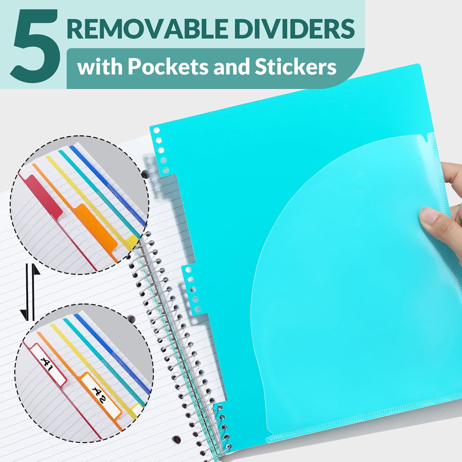 SUNEE 5 Subject Notebook College Ruled - 400 Pages, 9"x11", 5 Pocket Colored Dividers, 3-Hole Punched Paper, Teal