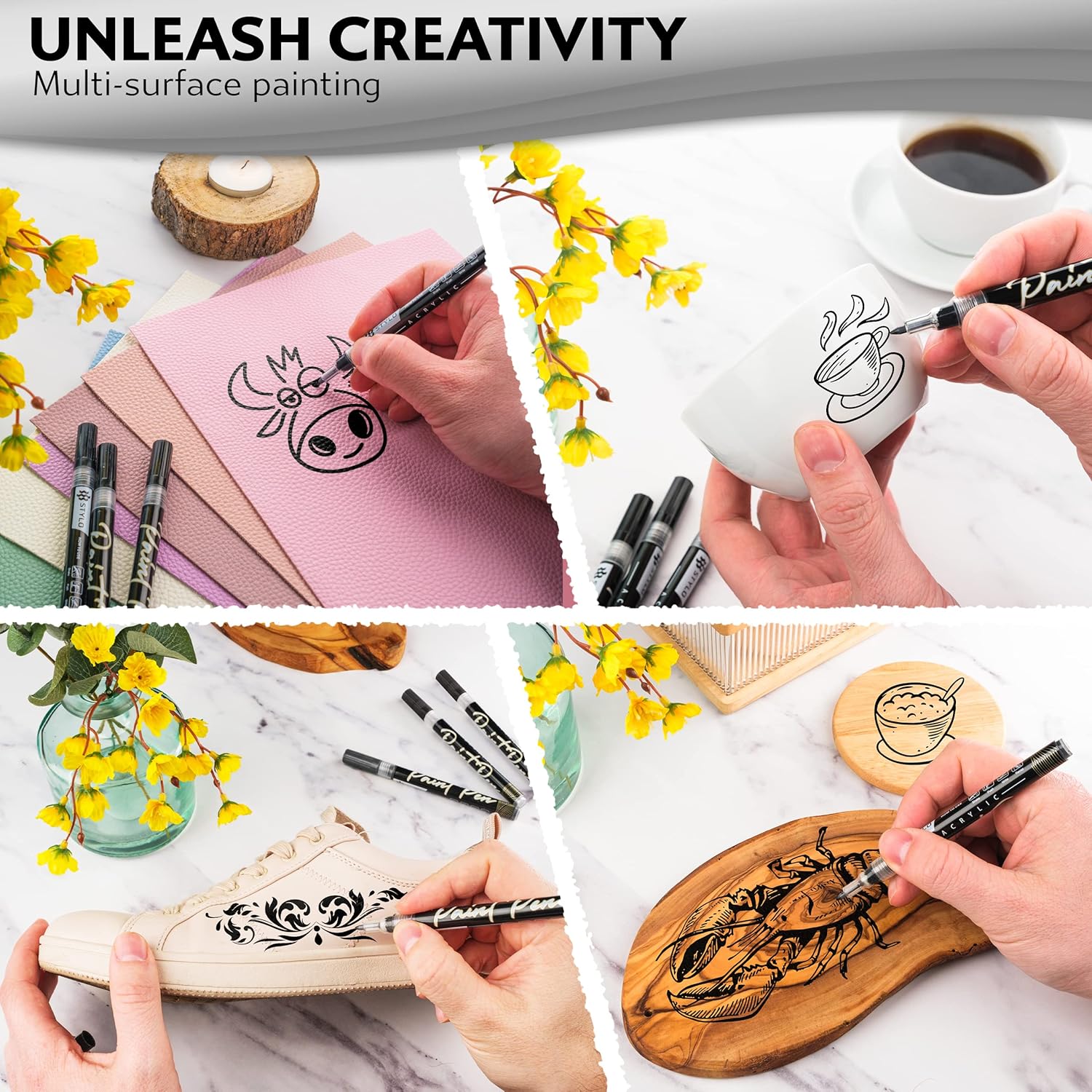 Stylo 4 Count Acrylic Metallic Pens - Black Paint Pens - Fine Tip Permanent Acrylic Metallic Paint Markers for Rock Painting, Glass, Wood, Ideal for Arts and Crafts (Pack of 4, Black)
