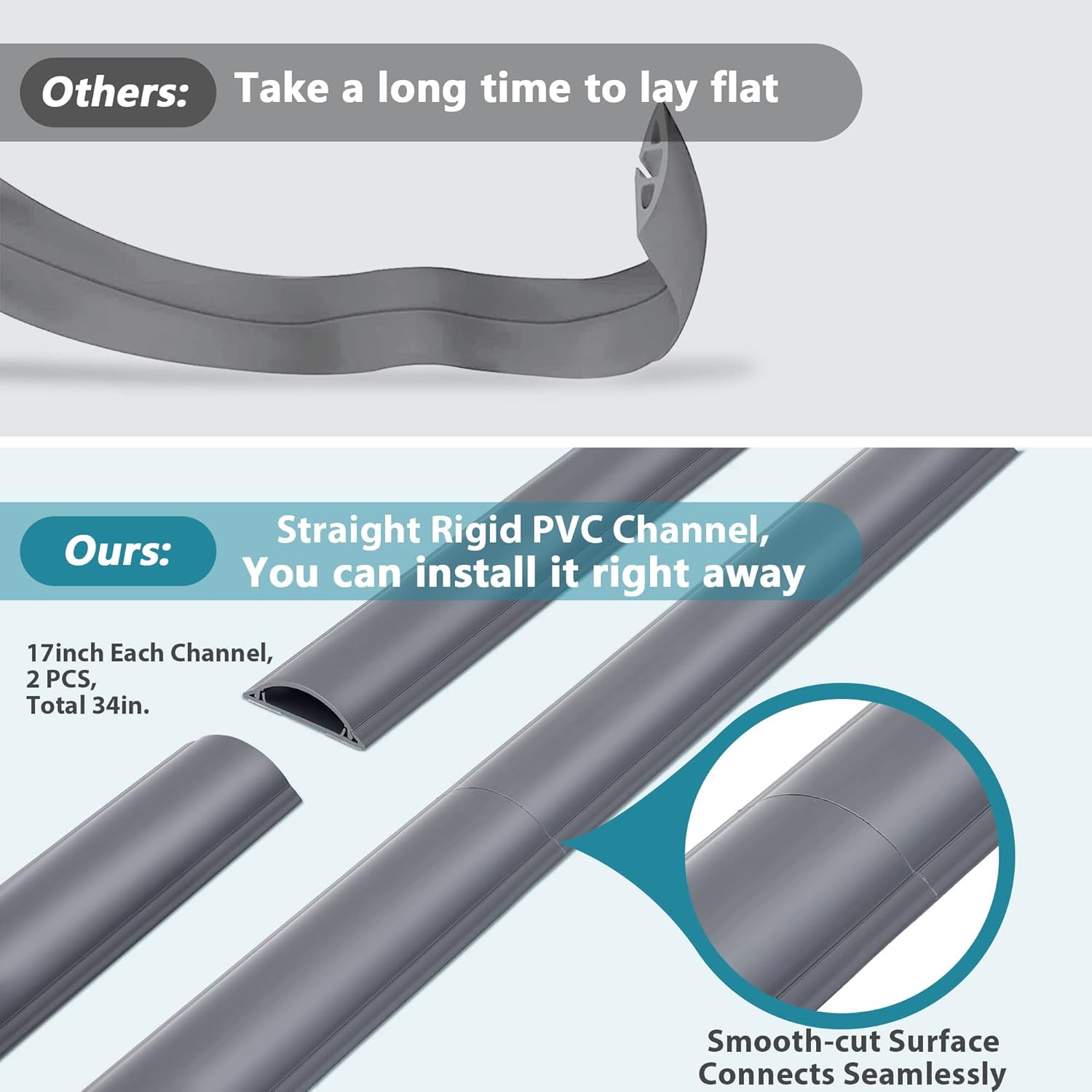 - Rigid PVC Floor Cord Cover: 2x17in, Total 34in; Smooth-cut Surface. Seamless connection. Thick (2.5 mm) and sturdy cable cover. A new type of cord floor cover for flat and hard floors.