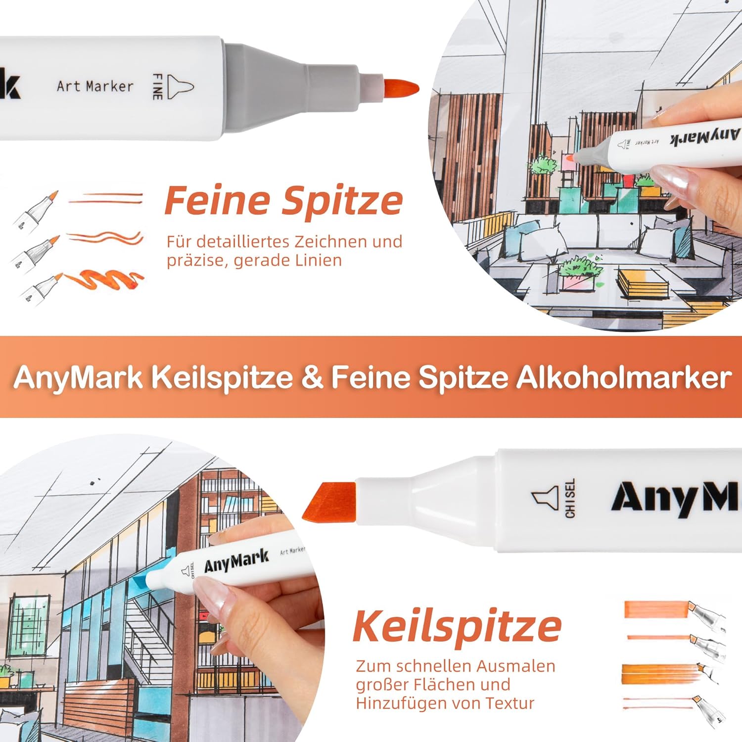 - DUAL-TIP ALCOHOL MARKERS - AnyMark coloring markers are designed with a unique dual-tip.The chisel tip (1-6mm) is perfect for quick coverage, while the fine tip (1-2mm) allows for details. You can effortlessly switch between broad strokes and fine details, making your creative process smoother and more enjoyable!