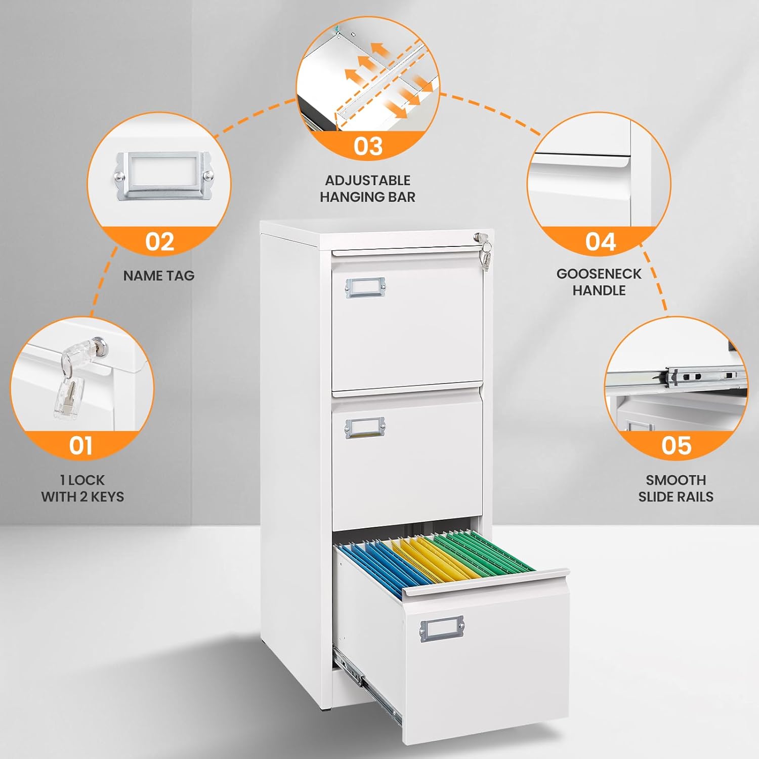 - HIGH-QUALITY CONSTRUCTION:✔✔For ensuring strong load capacity and great stability, we use high-quality sturdy metal steel material to ensure long-term use. The white filling cabinet with lock is highly loadable and each drawer can hold up to 55 LBS, and the surface is water-resistance and easy to clean.