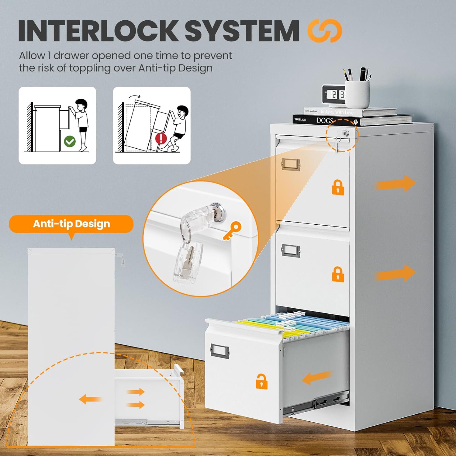 - METAL LOCKING FILE CABINET:✔✔AFAIF lockable file cabinet has one lock which locks all drawers, when one drawer has been opened, the interlocking drawer system prevents the other drawer from opening, which prevents tipping. And this office is equipped with two keys, which can help you keep your valuables and documents safe.