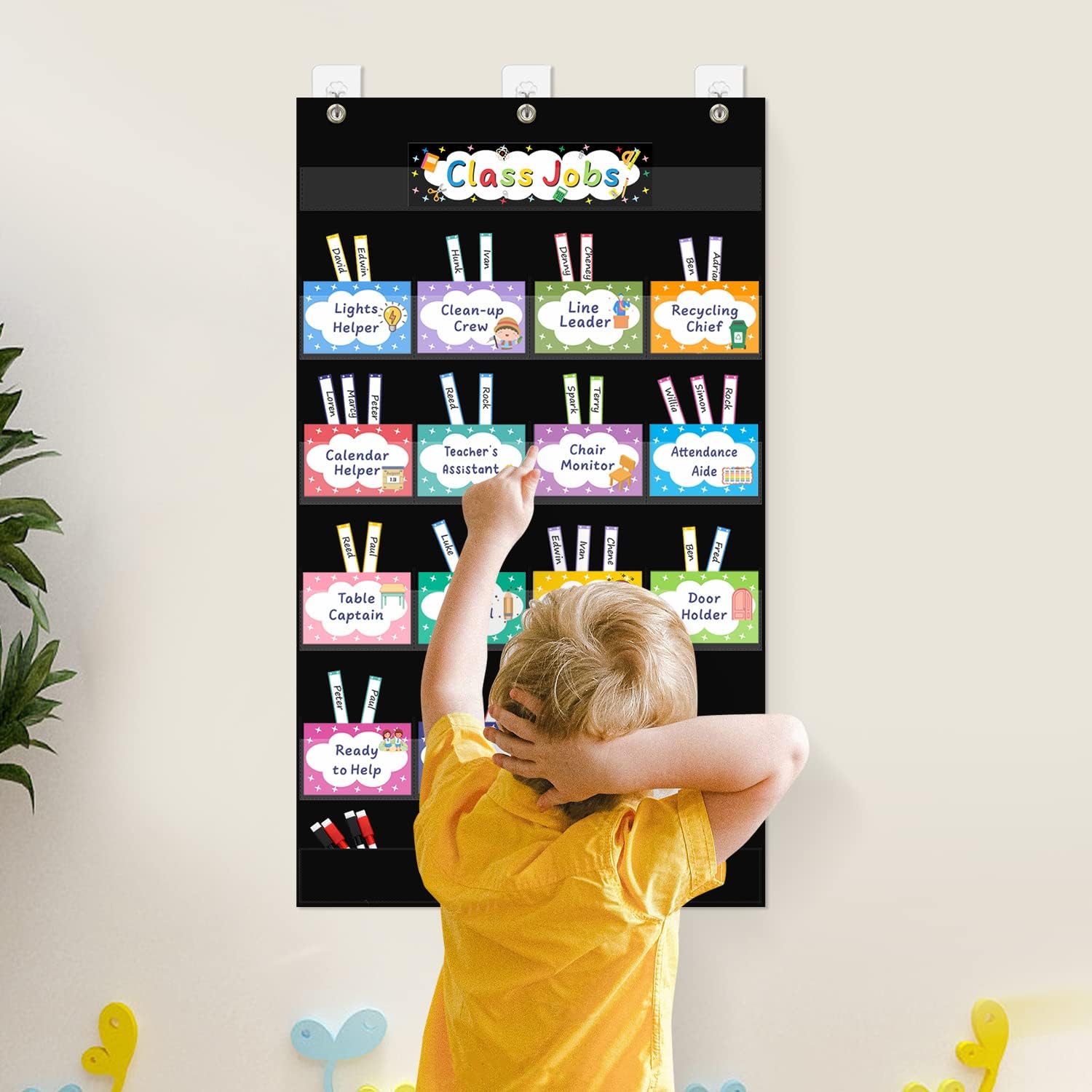 - ※【Designed Specifically for Class】The teacher's helper pocket chart with 17 clear pockets and 70 pieces colorful cards.the class job pocket chart is a good choice for teachers to distribute class work, teaching young students about responsibility, helping their classmates, and working as a team.
