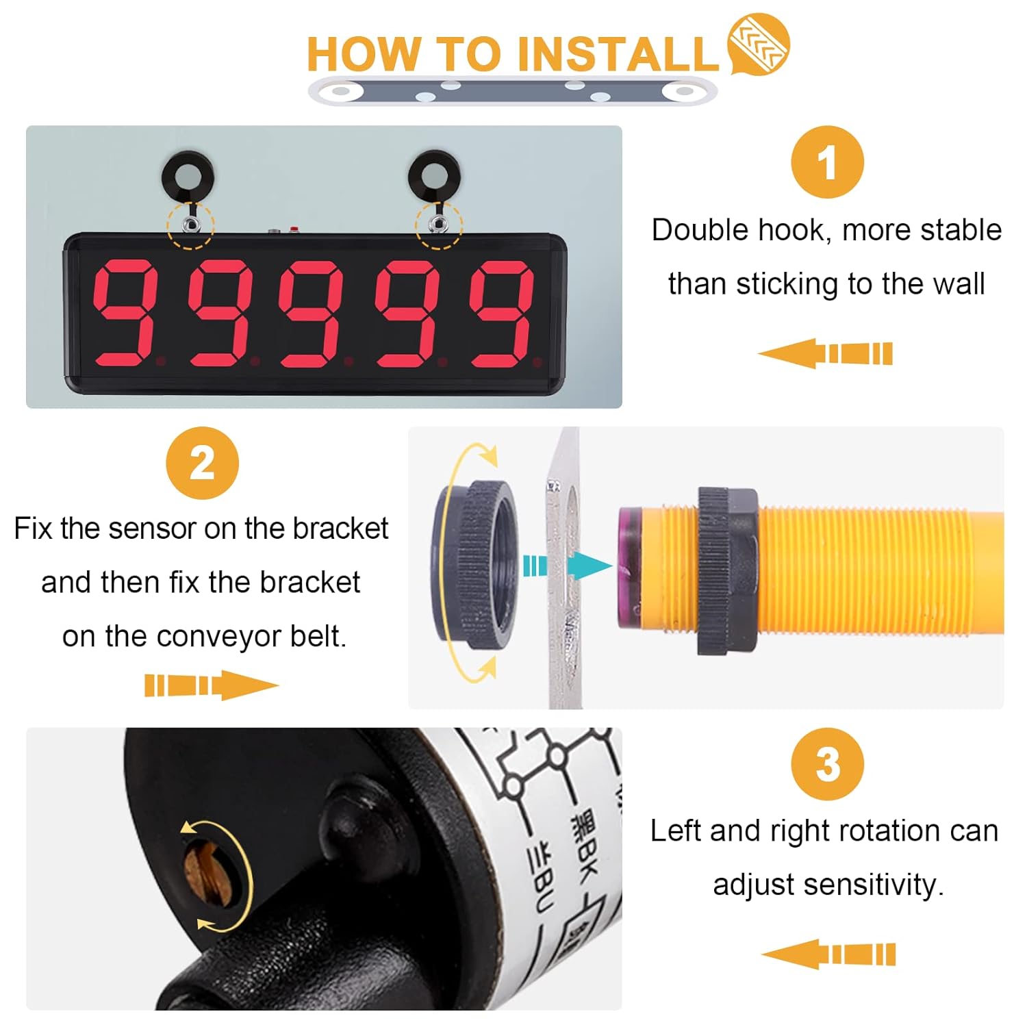 - COUNT UP to 99999: Automatically count up to 99999, put the probe on one side of the conveyor belt, and the machine will start counting automatically. Easily solve production counting problems, widely used in factories and assembly lines.Can't sense transparent objects.