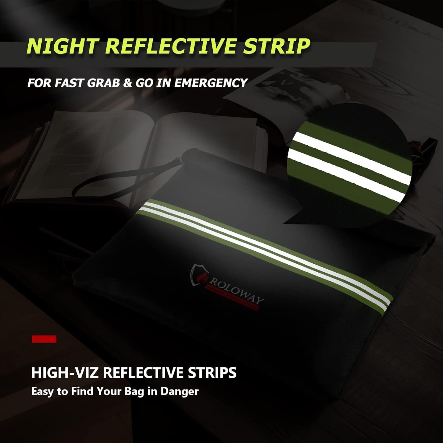 - [NIGHT REFLECTIVE STRIP DESIGN]: In emergencies, every second counts. Our fireproof money bag for cash is equipped with a specially designed Night Reflective Strip for quick and easy location, even in the dark. The High Visibility Design of our fireproof bags for cash and documents allows for faster retrieval of your most precious items, making our fireproof bag suitable for a swift Grab & Go during emergencies.