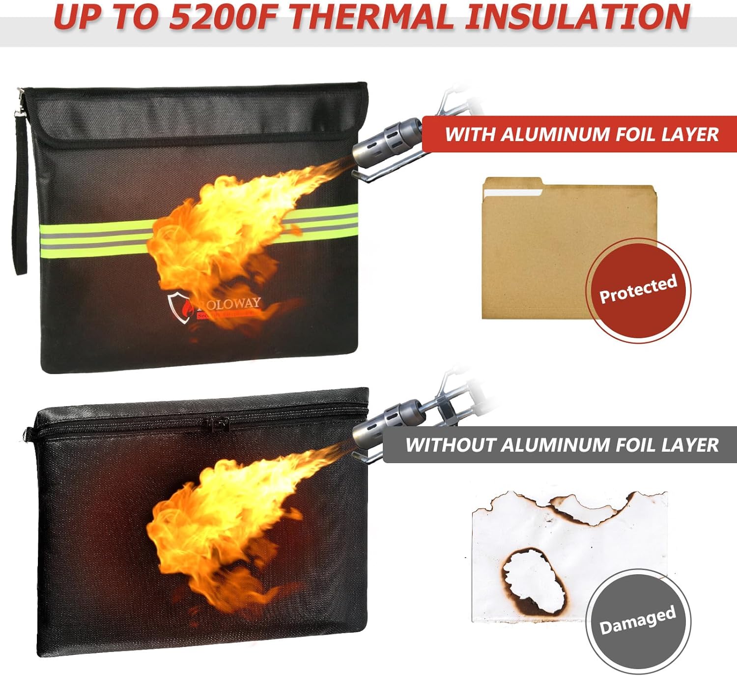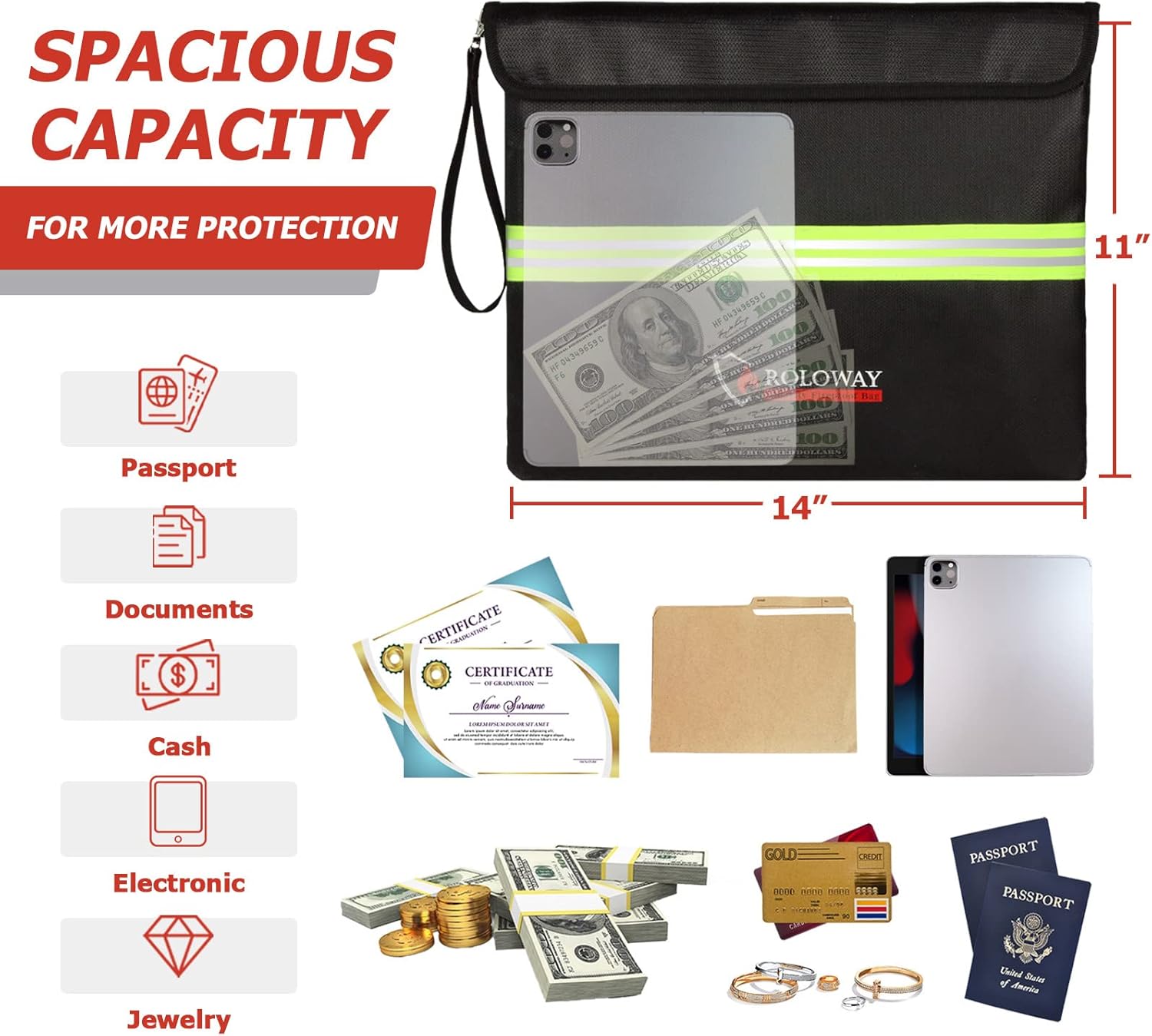 ROLOWAY Fireproof Document Bag (14 x 11 inch) with 5200℉ Upgraded Aluminum Foil Layer, Fireproof Bag for Documents with Reflective Strip and Zipper (Black)
