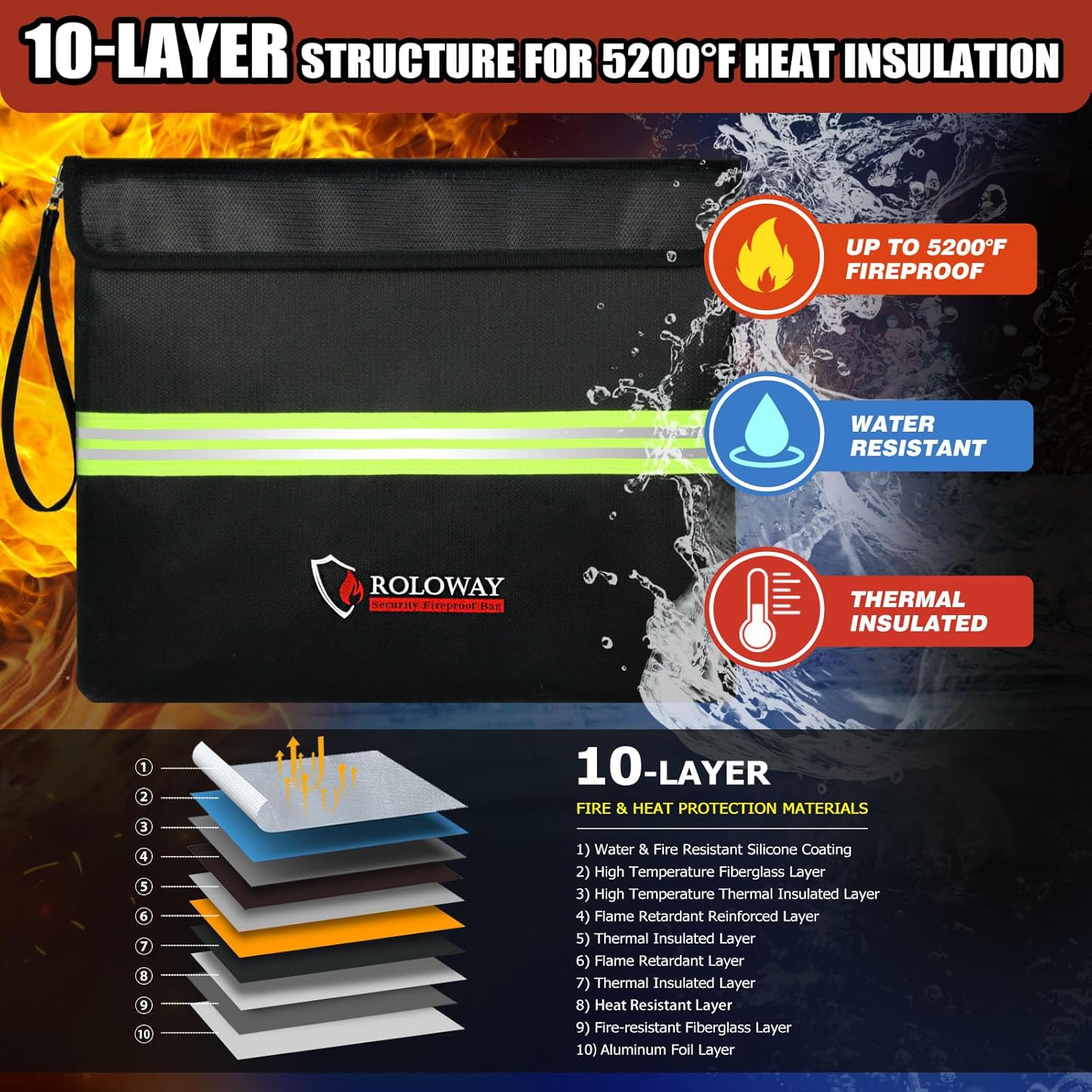 - [UPGRADED FIREPROOF & WATER-RESISTANT BAG]: Our Upgraded Fireproof Bag is Equipped with 10-LAYER Structure (Silicone Coating Layer, Fireproof Fiberglass (x3), Flame Retardant Layer (x2), Thermal Insulation Layer (x3), and an ALUMINUM FOIL LAYER). This fireproof document safe offers excellent heat insulation, capable of withstanding temperatures up to 5200 F for a certain period (UL94 VTM-1). Additionally, the silicone coating and hook & loop closure provide extra water resistance.