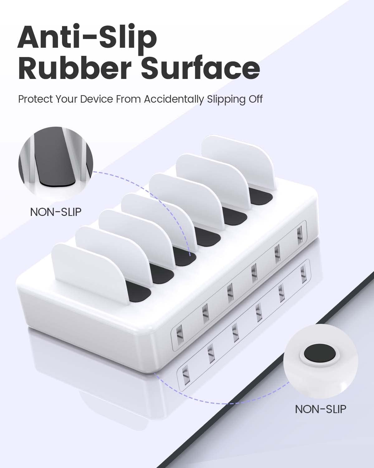 - ă6 IN 1 Charger StationăThe charging station for multiple devices comes with 6 USB ports that hold various devices all in one place, keeping your phones, watches, earbuds, power banks, tablets, and other devices charged quickly and efficiently at one time. Our multi charger station is faster than regular chargers. It can charge your devices up to 80% faster because it provides more power - up to 2.4A compared to the 1A provided by regular chargers