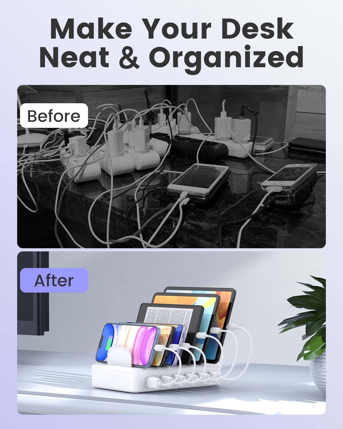 - ăSpace Saver Gadgetă Effortlessly charge your iPhone with our all-inclusive phone charging station featuring 6 short cables, a 4.92-foot-long power cord, and a Type-A to Type-C adapter converter for ultimate convenience and versatility. CREATIVE DESIGN charging station keeps your devices nicely organized in a row, and there are no more adapters and tangled cords everywhere