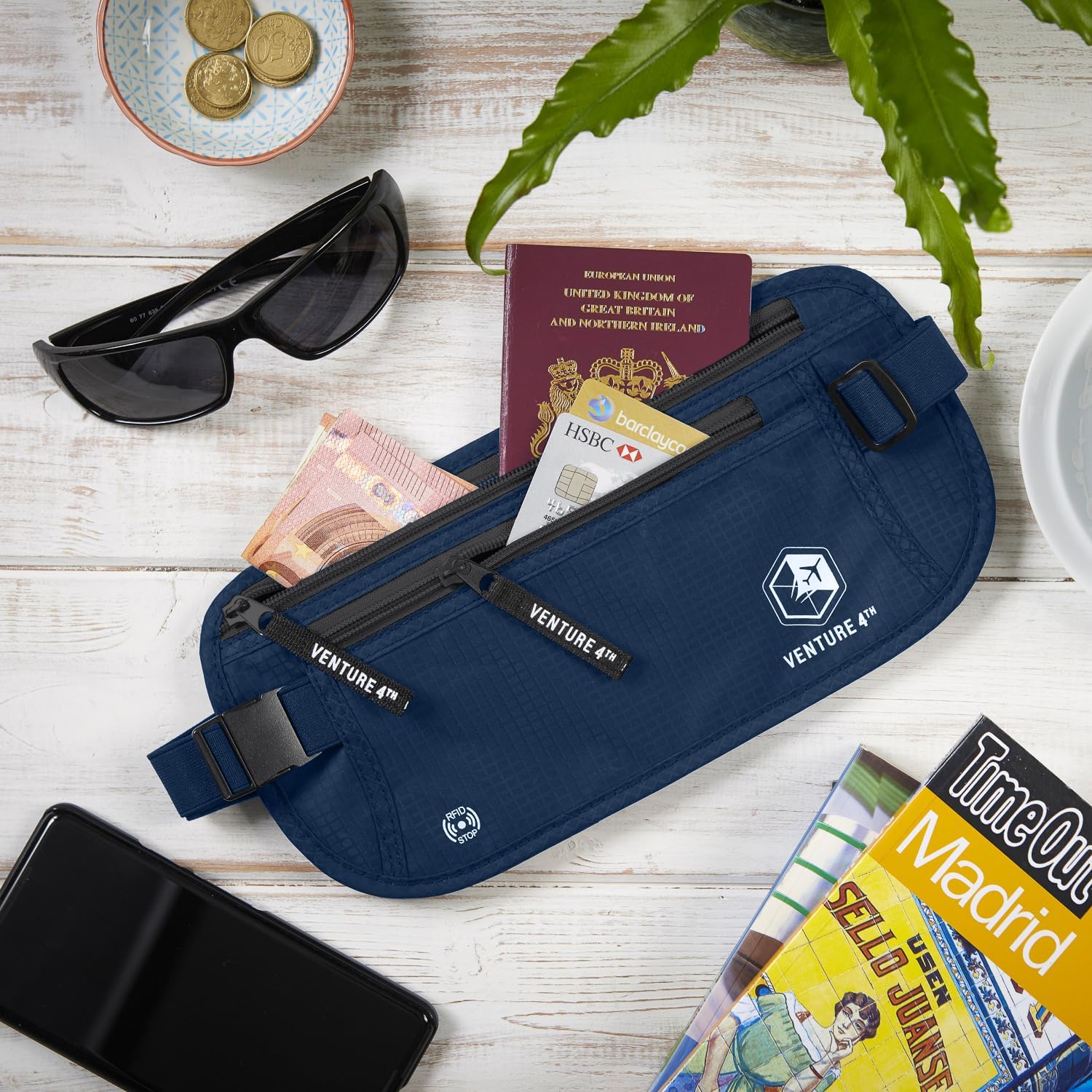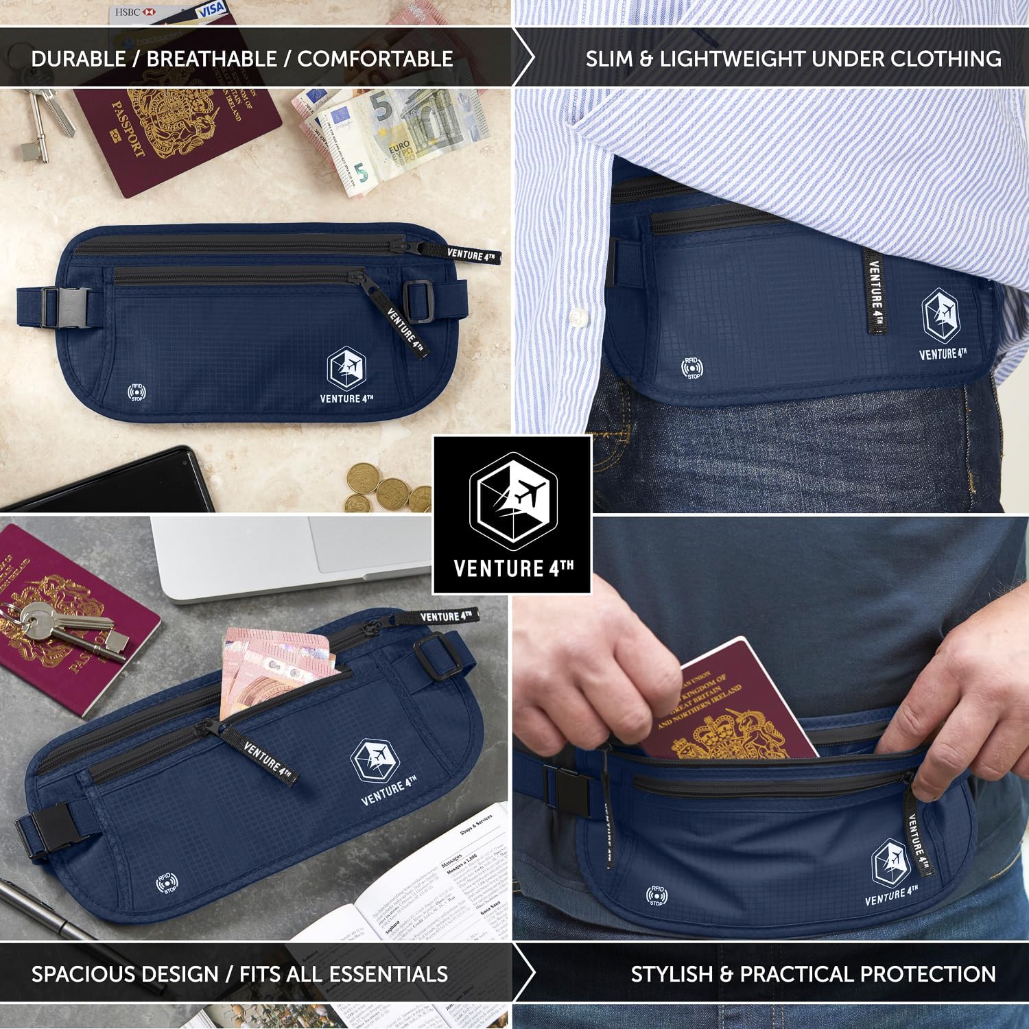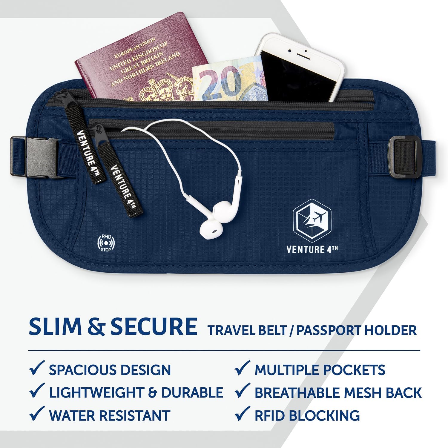 VENTURE 4TH Travel Money Belt - Slim Passport Holder RFID Blocking Travel Pouch to Protect Cash, Credit Cards and Travel Documents (Navy Blue)