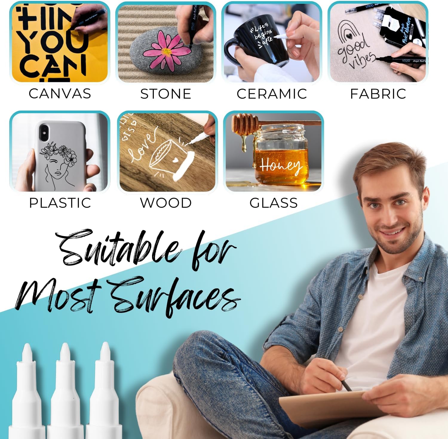 - MULTI-SURFACE APPLICATION: These versatile paint pens are suitable for use on a variety of surfaces, including stone, wood, glass, fabric, plastic, ceramic, metal, rubber and more, allowing you to unleash your creativity on any medium.
