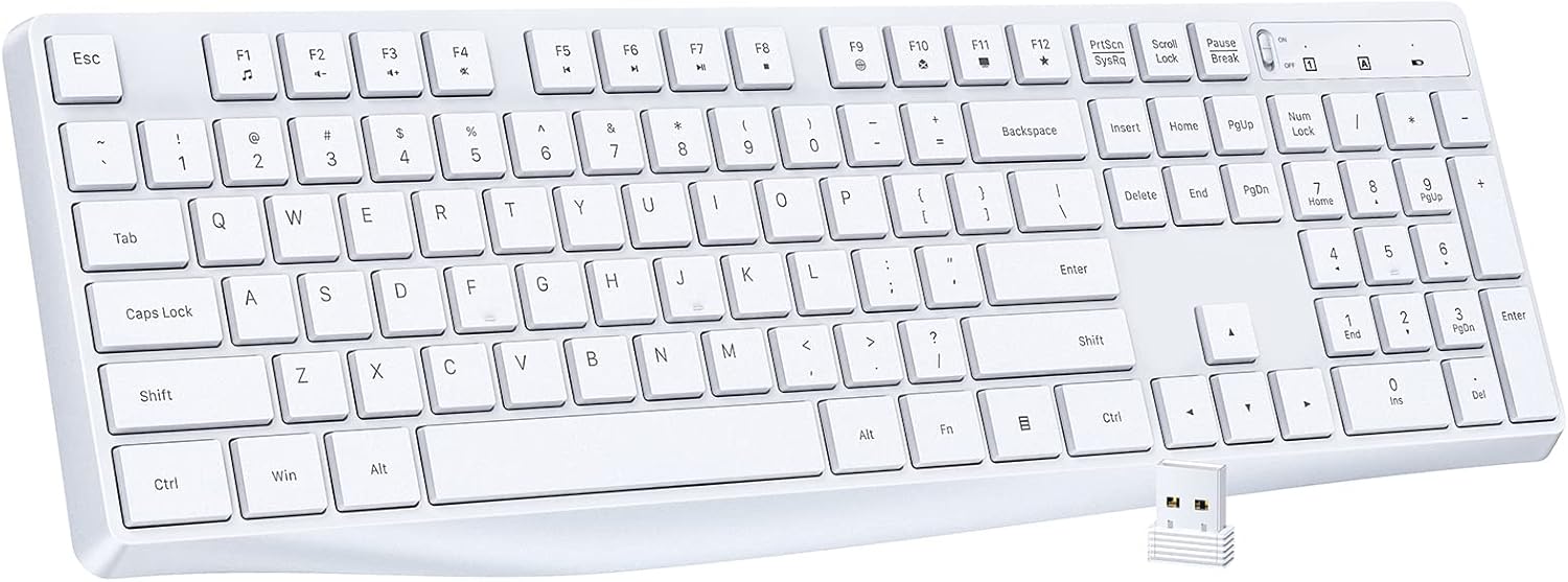 - ▶ FULL SIZE EXCELLENT TYPING : Each low profile key of the wireless keyboard allows for increased stability, while optimized key travel provides a comfortable and precise typing experience. The 12 multimedia shortcuts greatly simplify your work and more focus on the task at hand.The numeric keypad is also great for spreadsheets and finance applications.Notes: 12 easy access shortcuts cannot be compatible with Mac.