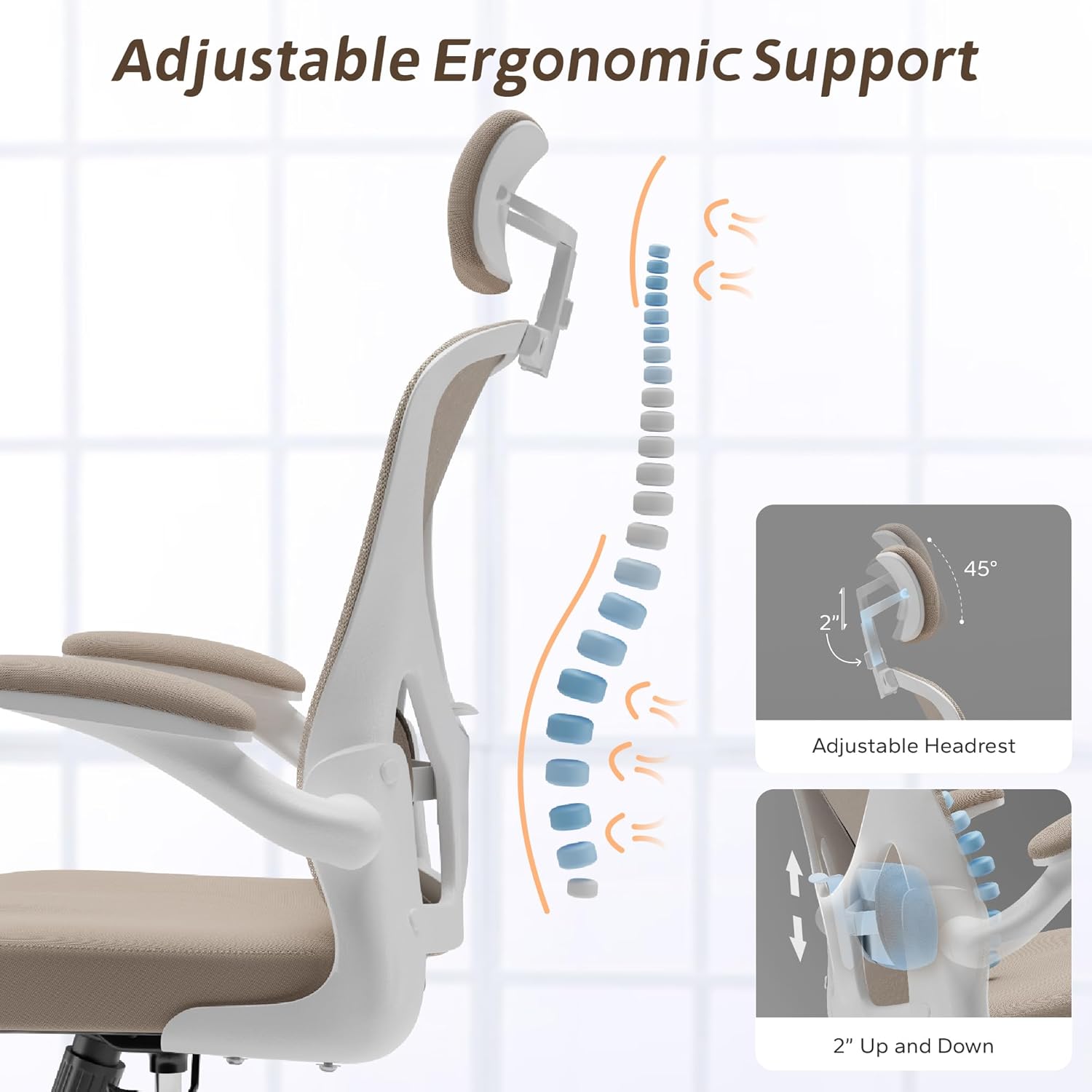 Ergonomic Office Chair with Adjustable Flip-Up Armrests & Lumbar Support - Thickened Cushion Desk Chair with Wheels, Comfy Home Office Computer Chair