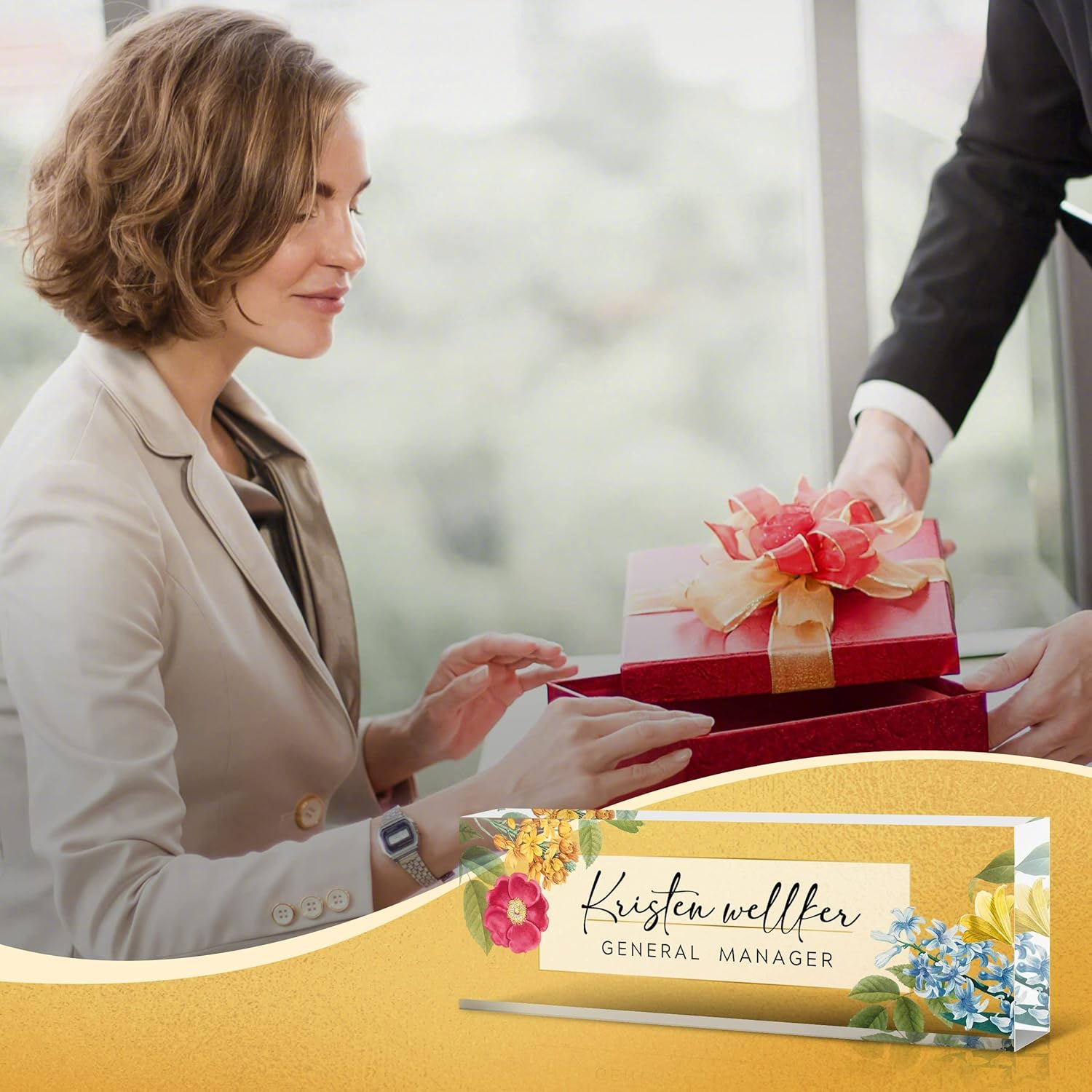 Desk Name Plate Personalized, Premium Plum Blossom Hyacinth Acrylic Desk Name Plate, Personalized Name Plate for Desk, Office Decor for Women or Men Coworkers, Boss, Employee, Teacher