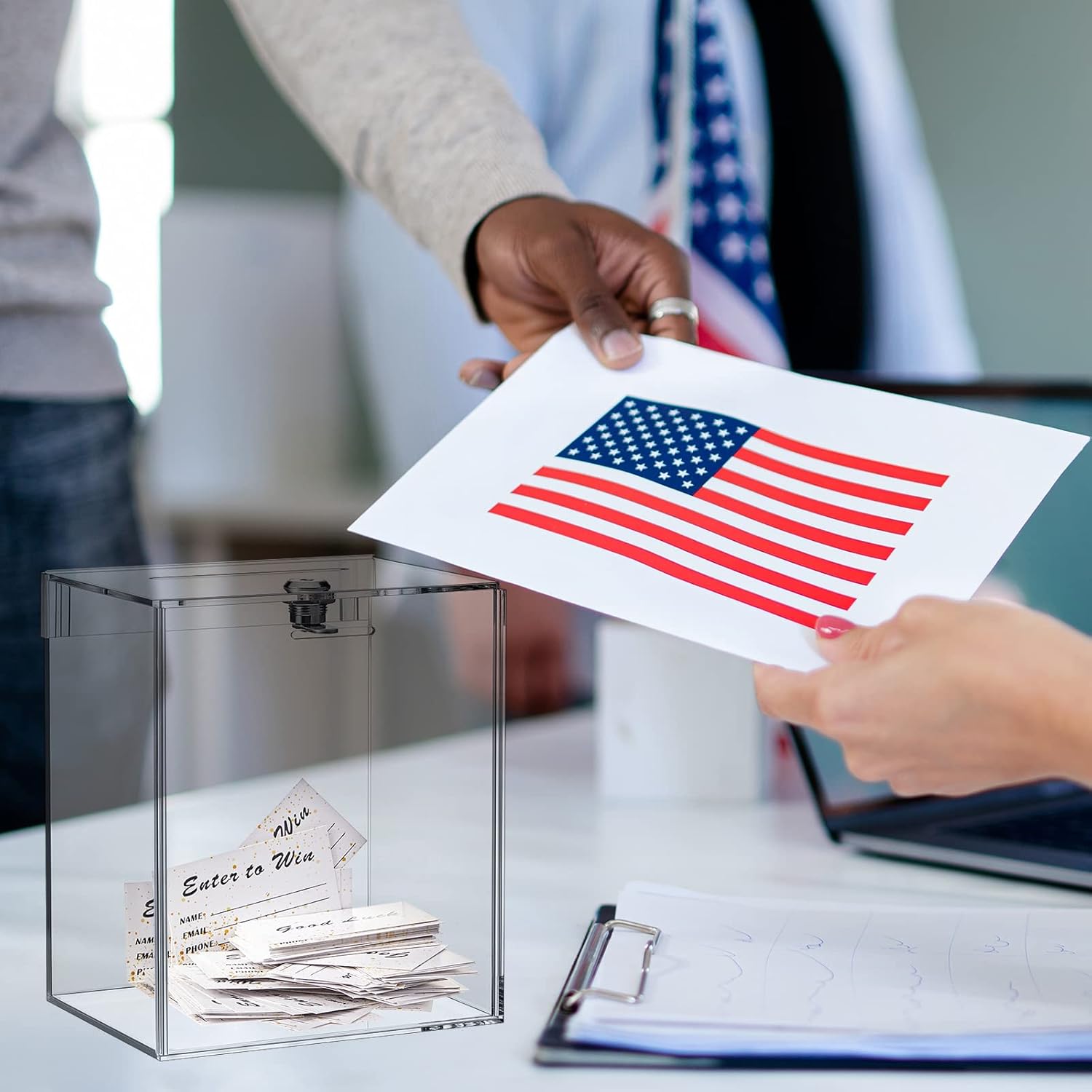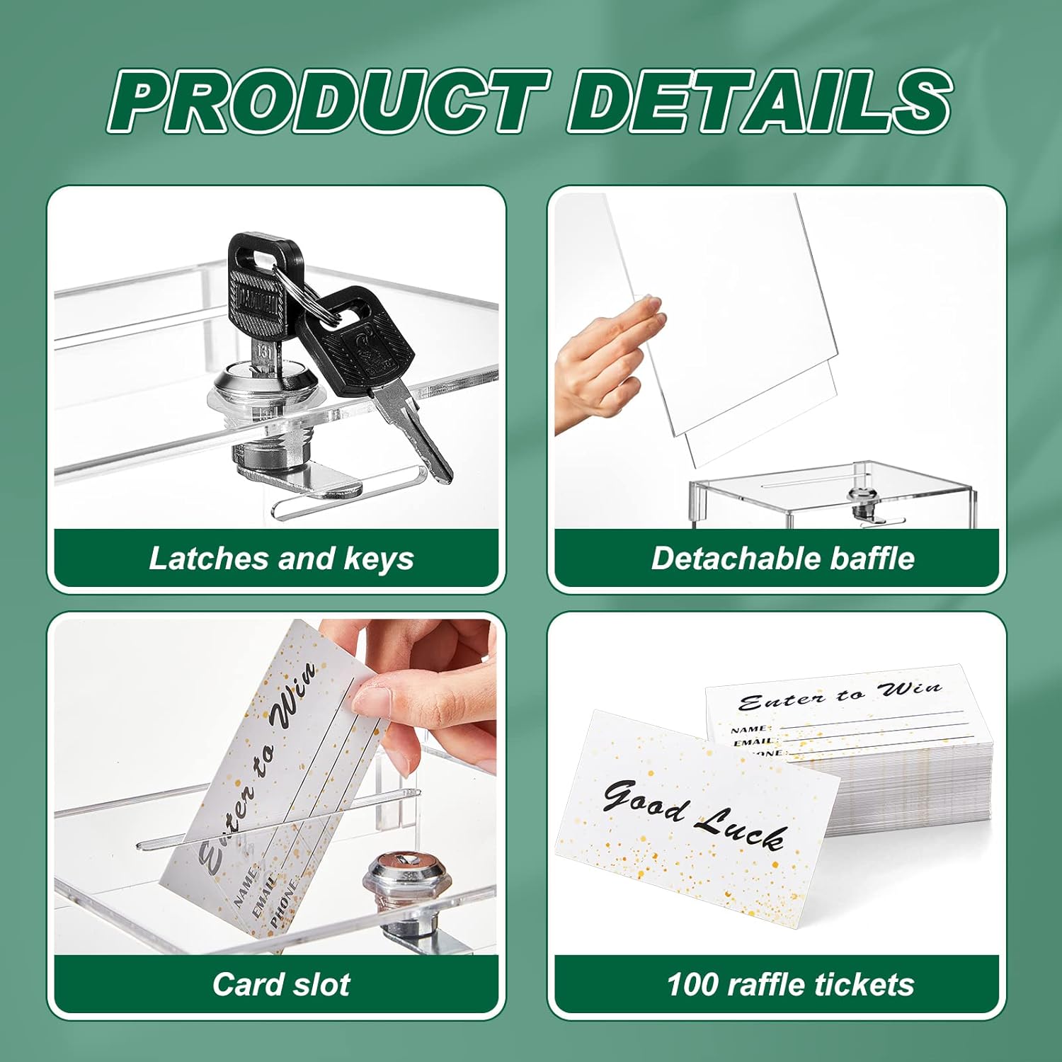 - Package and Size Information: you will receive 1 piece of tall acrylic donation box with sign plate, 100 pieces of raffle tickets cards; Acrylic donation box is approx. 6.7 x 5 x 8 inches, sign plate is approx. 6.7 x 8.2 inches, and raffle tickets card is approx. 3.5 x 2 inches; The ample quantity and suitable size can certainly meet your voting and suggestion collection needs; PS: poster not included