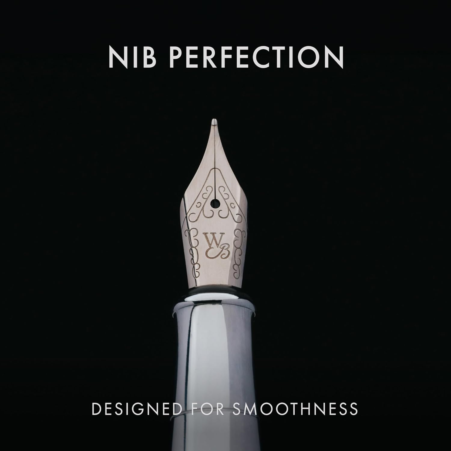 Wordsworth & Black Fountain Pen Set, Medium Nib, Includes 24 Pack Ink Cartridges, Ink Refill Converter & Gift Pouch, Chrome Finish, Calligraphy, [Silver Chrome], Perfect for Men & Women