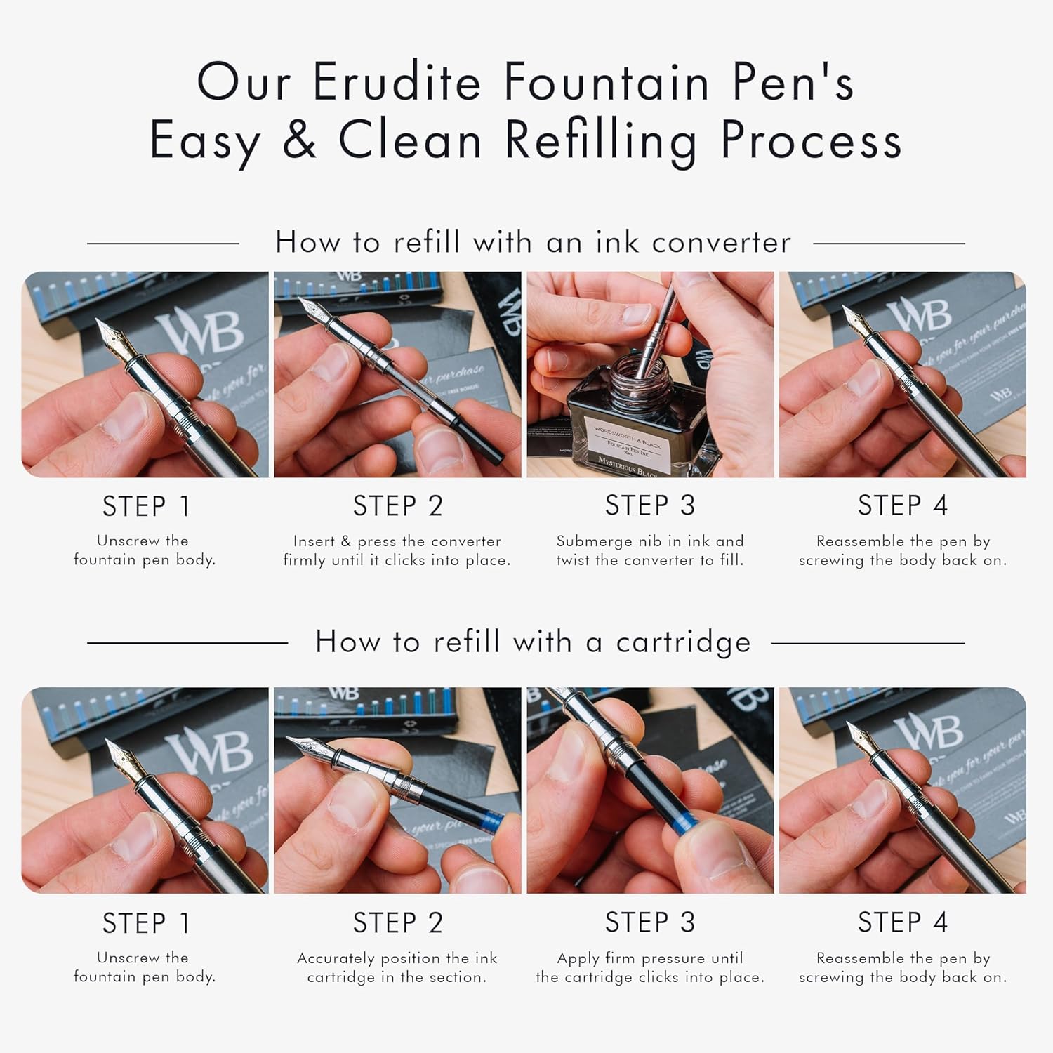- ✒️Discover The All-inclusive Refillable Fountain Pen Set - Includes luxurious fountain pen, ink converter, 24 Pack Ink Cartridges, and a Gift Pouch - ready to be gifted. Each calligraphy ink and fountain pen ink cartridges comes in a plastic re-closable case and will last you at least 2 weeks of regular use. With every order is a complete instruction booklet for your Wordsworth and Black Pen Set. All the information you'll need to get started using and enjoying your luxurious writing tool!